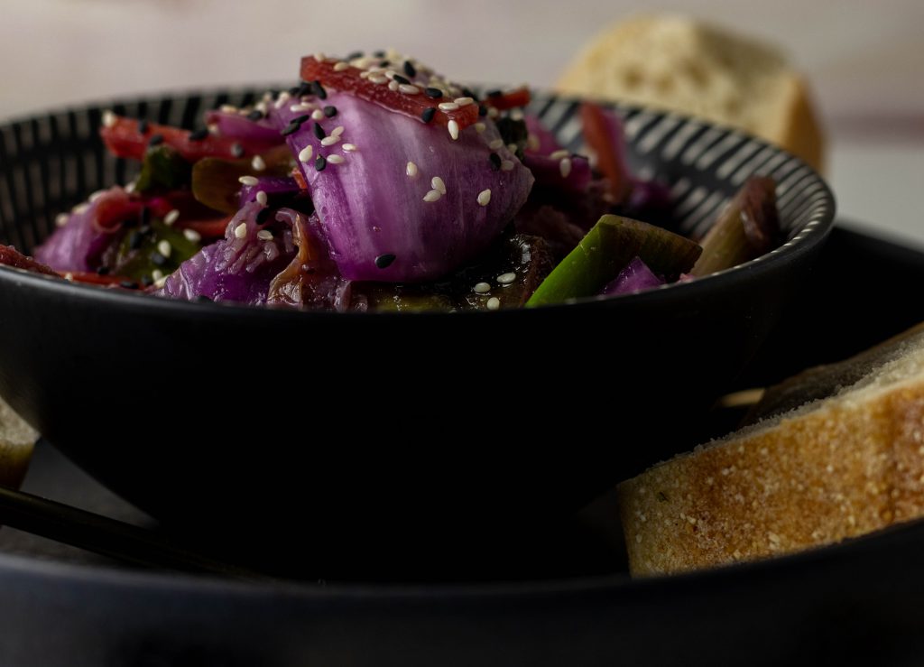 Ich habe mich bei meinem Kimchi Rezept an der traditionellen, koreanischen Zubereitungsart orientiert. Jedoch nutze ich keinen Rettich, dafür Rotkohl, der meinem Kimchi eine tolle Farbe und Knackigkeit verleiht. Außerdem würze ich natürlich vegan, nicht mit Fisch.