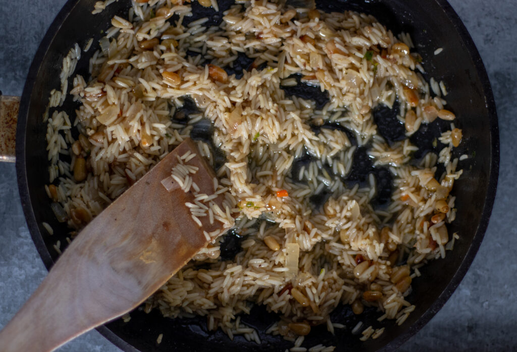 1. Zubereitung der Füllung mit Pinienkernen und Reis.