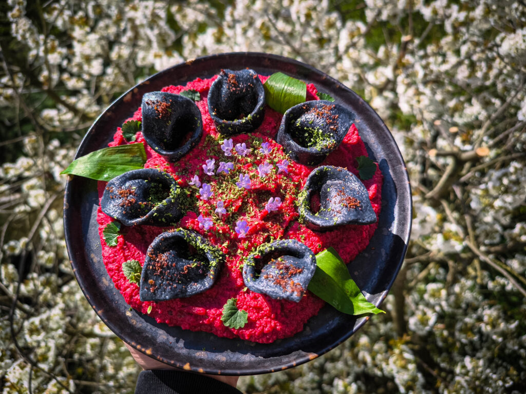 Frischer Bärlauch küsst cremigen, selbstgemachten, veganen Ricotta, ummantelt von zartem Pastateig, den ich mit Aktivkohle schwarz eingefärbt habe. Dieser Schritt ist natürlich optional, er dient nur als visuelles Highlight. Denn schwarze Tortellini setzen einen tollen Kontrast auf dem Teller und werten jedes Plating auf. Ideal für die vegane, gehobene Küche.