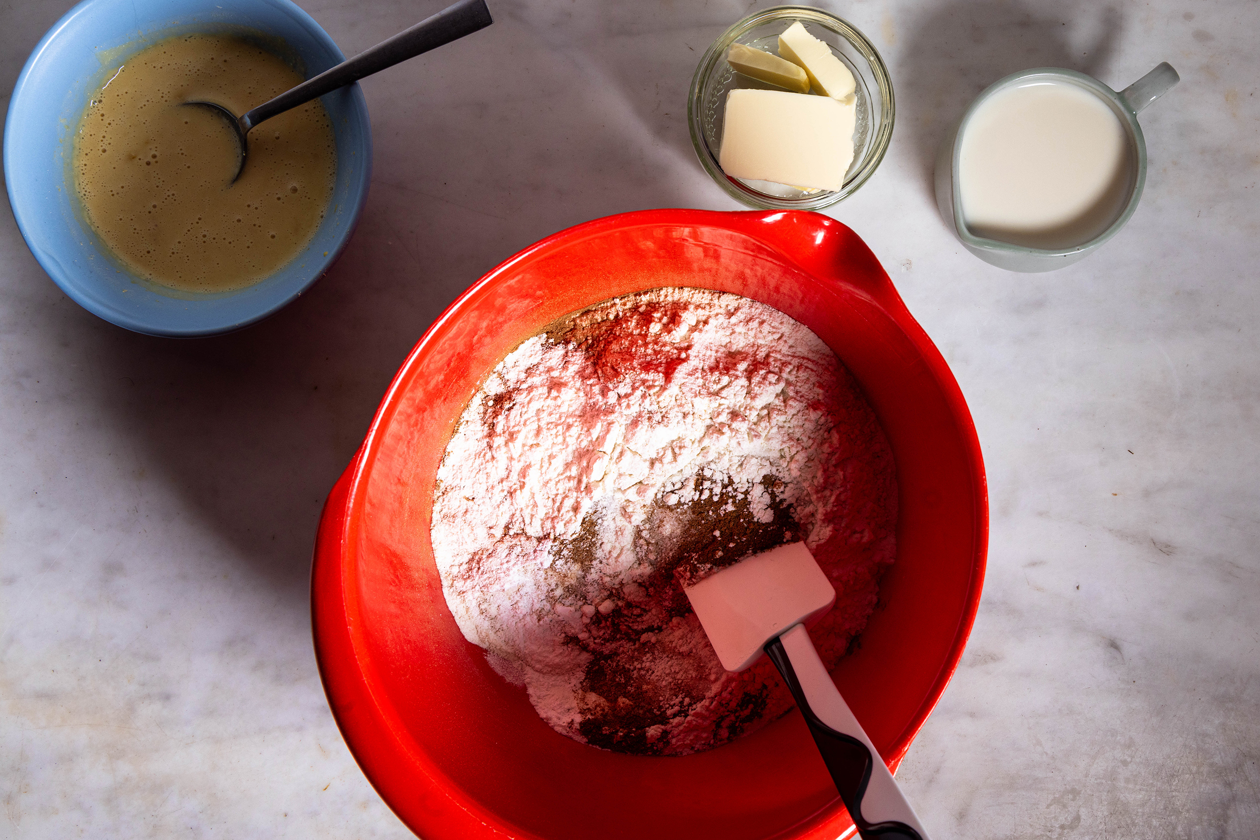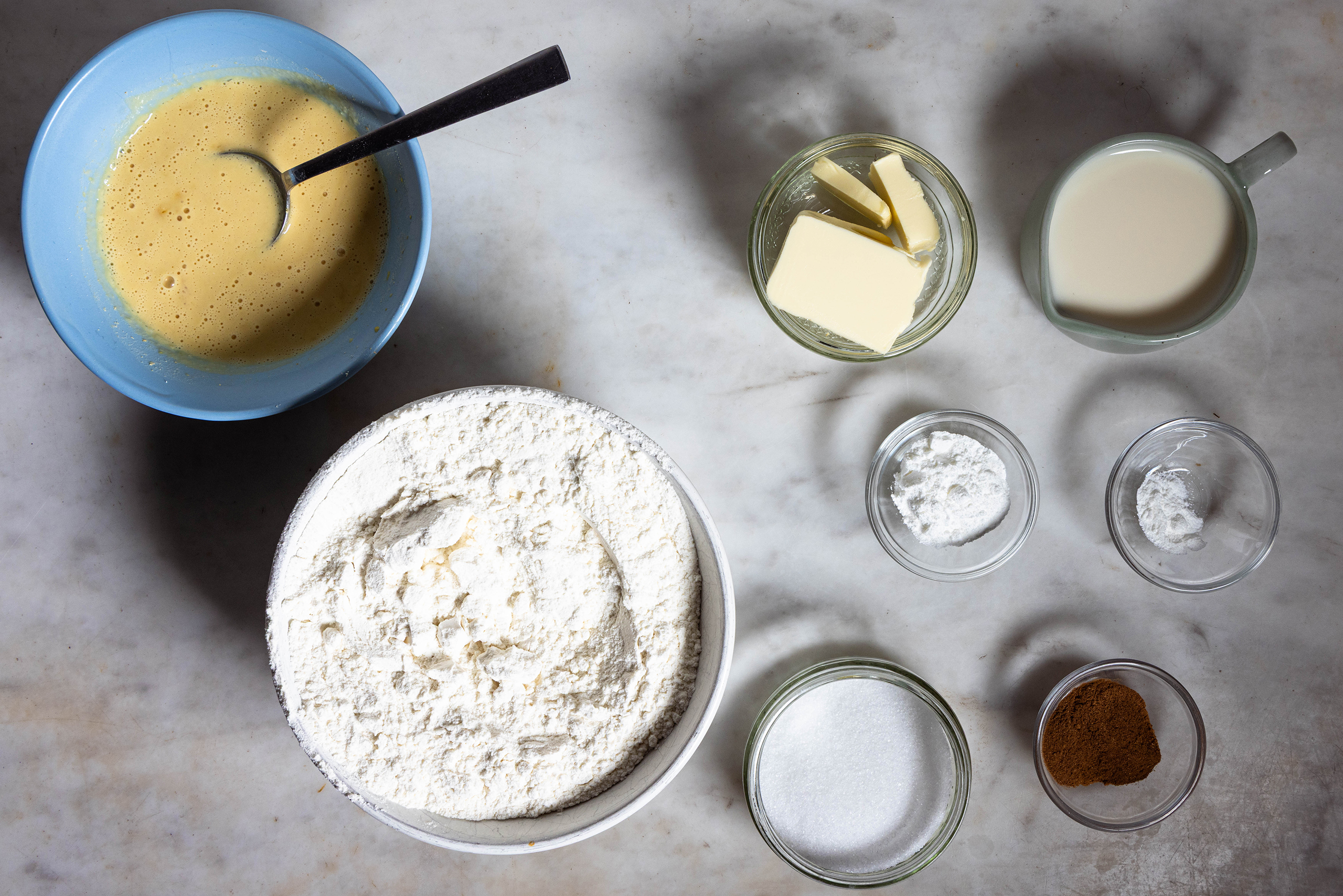 - Für den Teig Mehl, Backpulver, Natron, Zimt und Zucker vermengen.