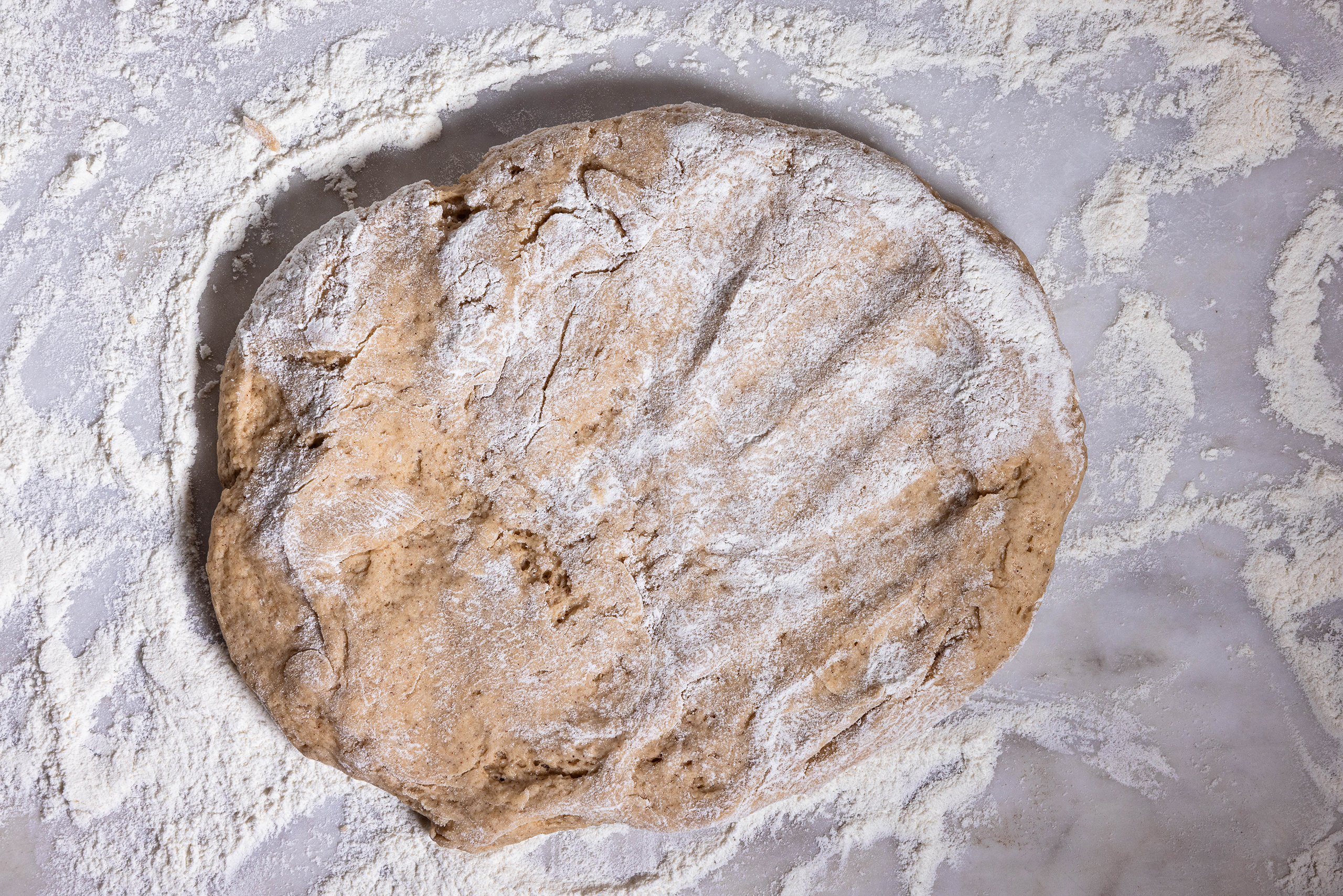 - Nun die Flüssigkeit zu den trockenen Zutaten geben und alles mit der Hand gut verkneten. Es sollte ein gut formbarer Teig entstehen, der nicht zu klebrig ist. Bei Bedarf noch etwas mehr Mehl einkneten.