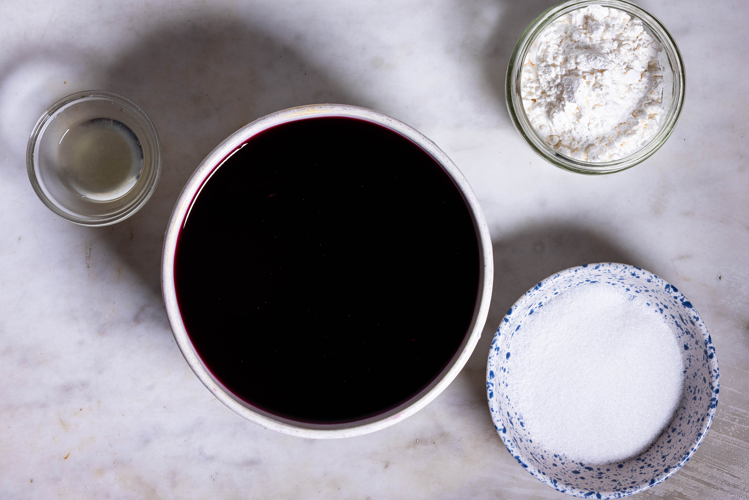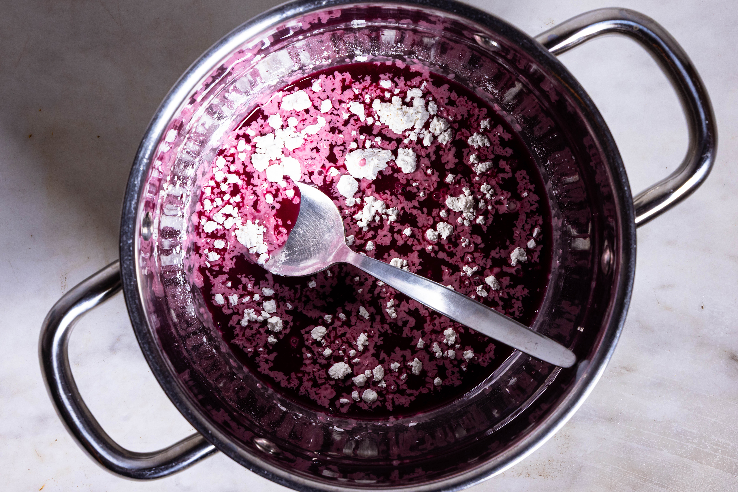 - Für die Füllung etwas Saft aus dem Blaubeerglas in einen Topf geben und mit dem Puddingpulver, dem Zitronensaft und dem Zucker verrühren.
