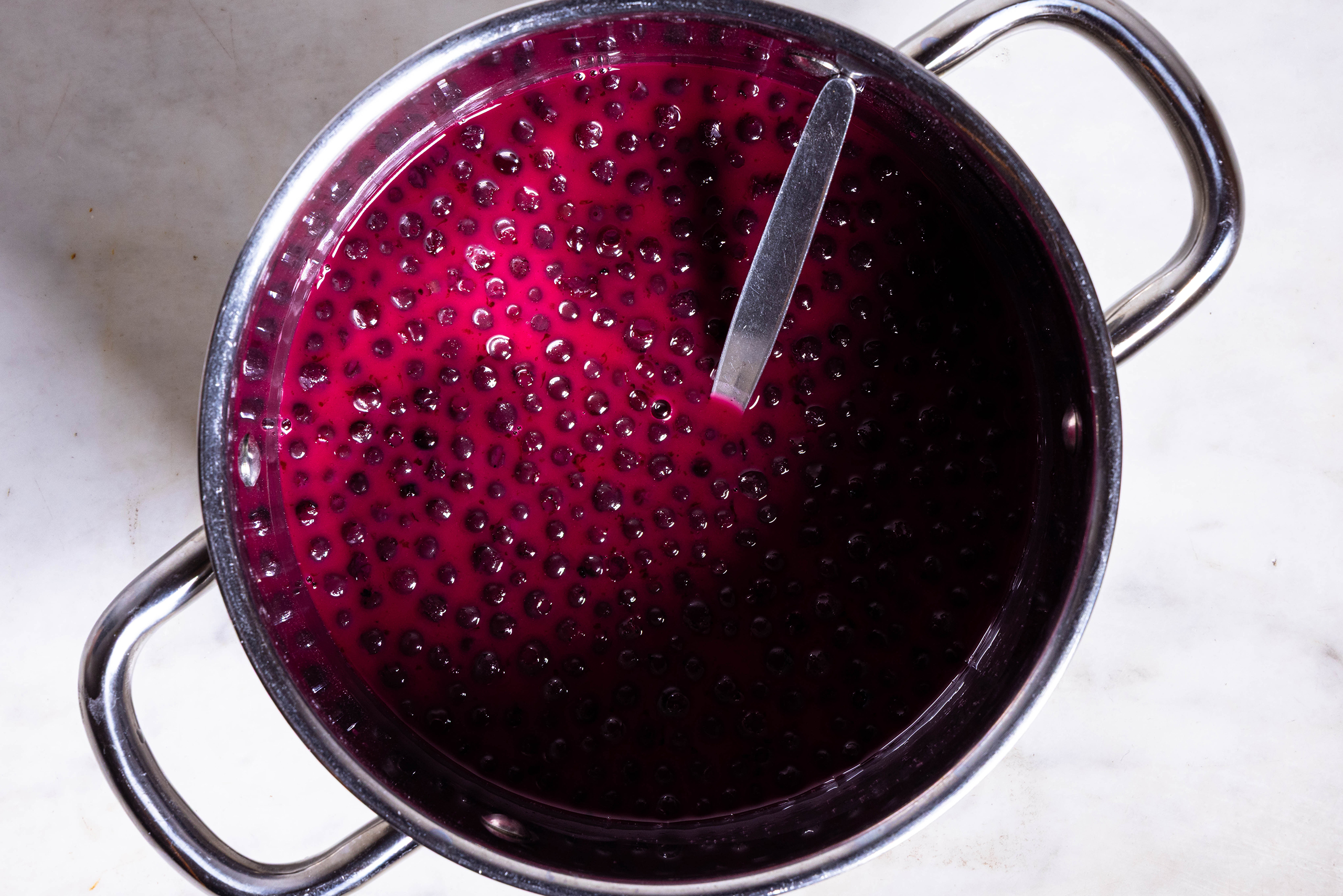 - Dann die Heidelbeeren und den restlichen Saft hinzugeben und unter Rühren einmal aufkochen lassen.