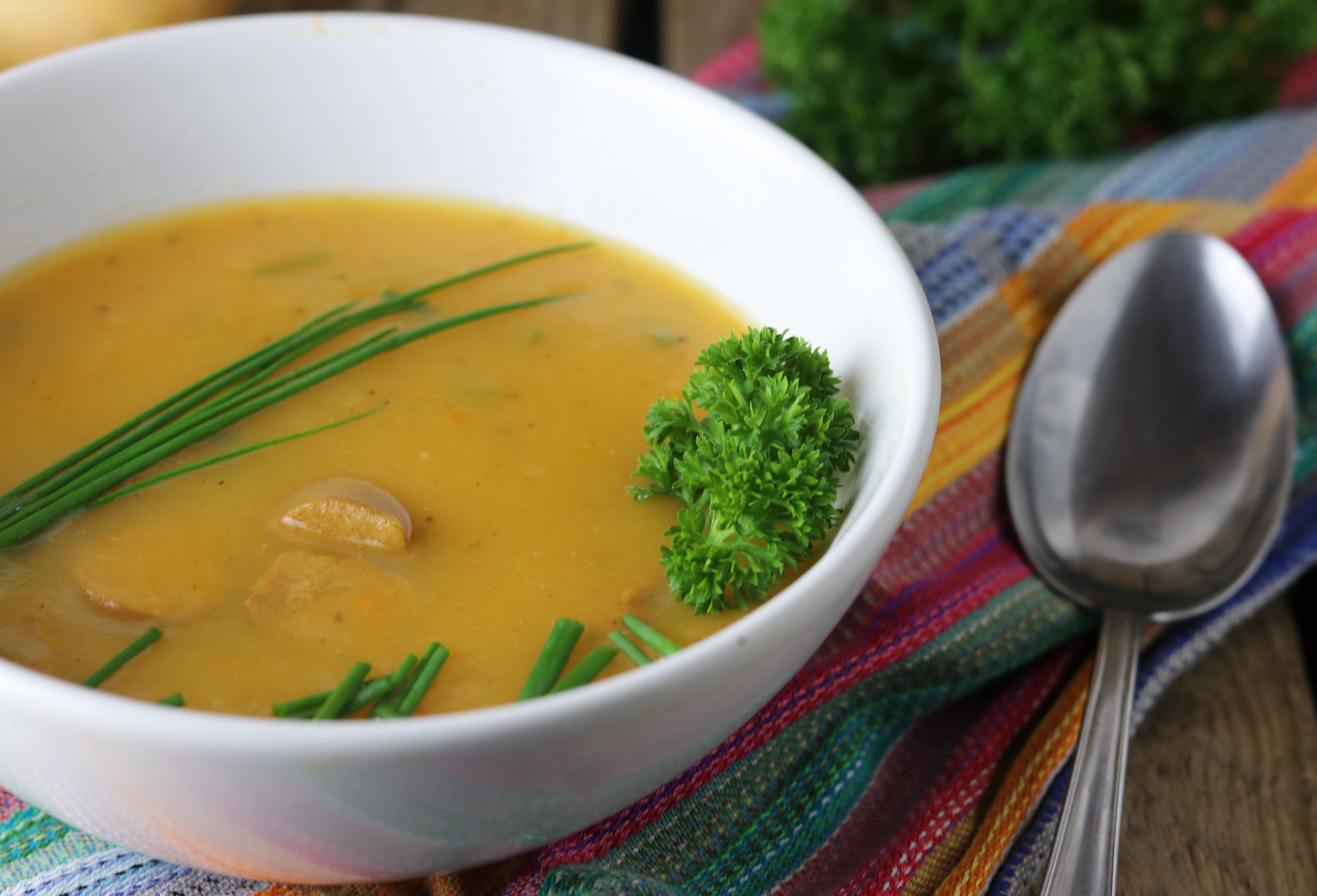 Kartoffelsuppe in einer Schale auf einem bunten Tuch, daneben ein Löffel.