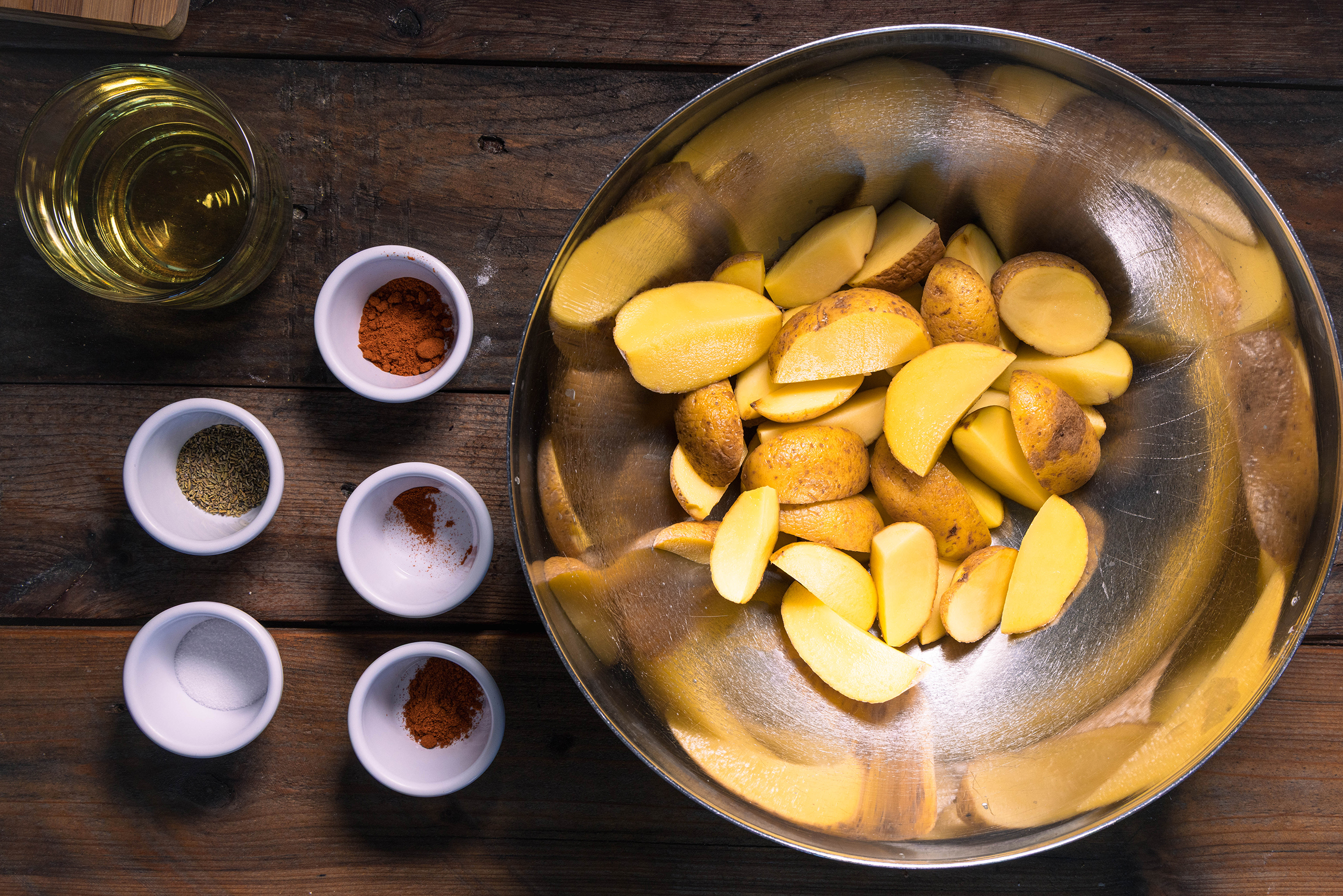 - Die Kartoffeln gründlich waschen und in Schnitze teilen.