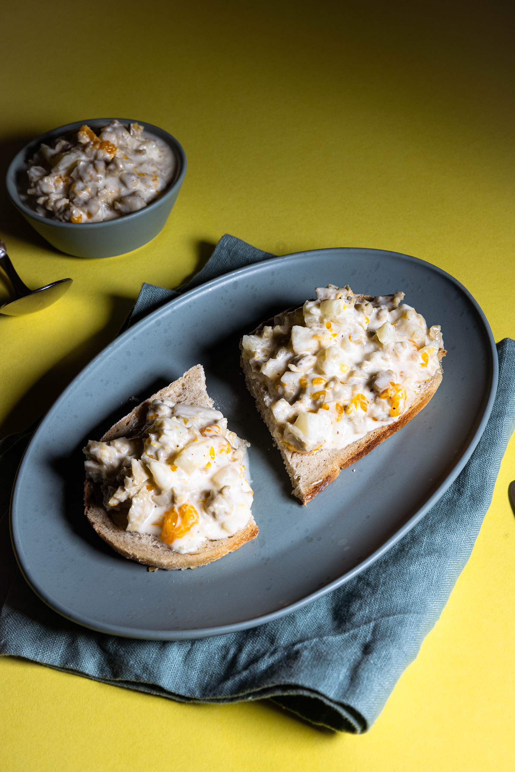 - Den veganen Geflügelsalat mit der Mayonnaise vermengen, mit Salz und Pfeffer abschmecken und mindestens eine halbe Stunde im Kühlschrank ziehen lassen.