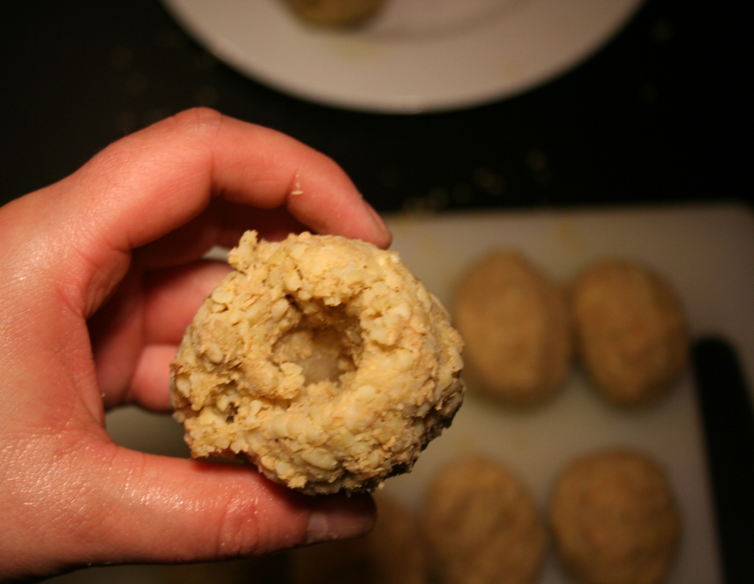 In der Mitte jeder Kugel ein Loch eindrücken und versuchen das Ei etwas von innen auszuhöhlen. Ungefähr einen Esslöffel der Masse hineindrücken und das Ei wieder verschließen.