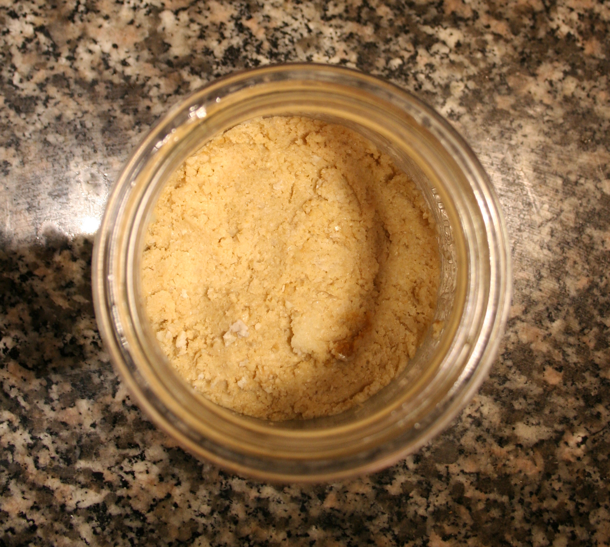 Die Nusspaste in ein sauberes Glasgefäß geben, das Glas sollte dabei nicht ganz voll sein, da der Käse noch ein wenig expandiert. Das Glas mit einem Mulltuch/Seituch abdecken. Das Tuch mit einem Gummiband fest machen.