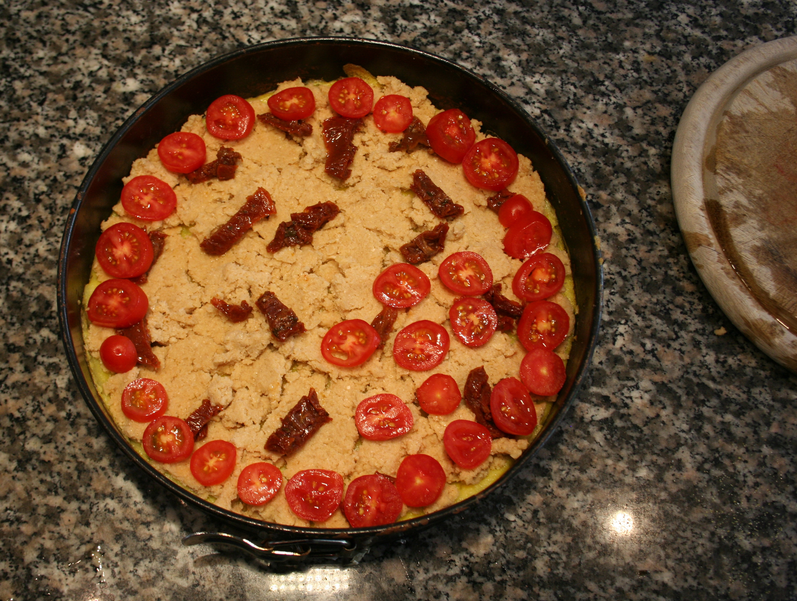 Eine 26cm Backform mit Backpapier auslegen oder eine Tarteform einfetten und die Polenta hinein füllen. Glatt streichen und für 20 Minuten im Ofen backen.