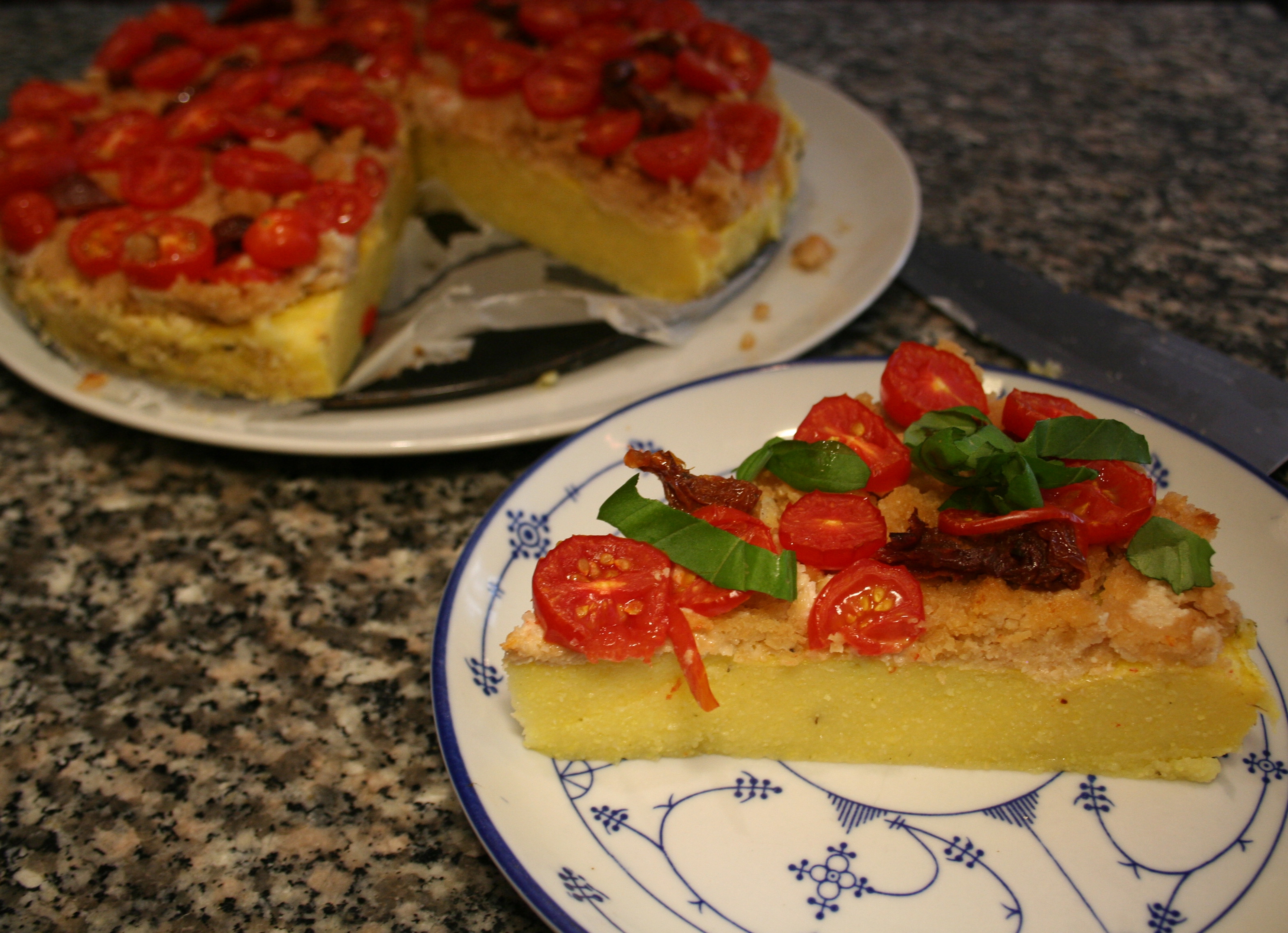 Die Polenta-Tarte mit Tomaten auf veganem Ziegenkäse schmeckt auch noch sehr gut kalt am nächsten Tag.
