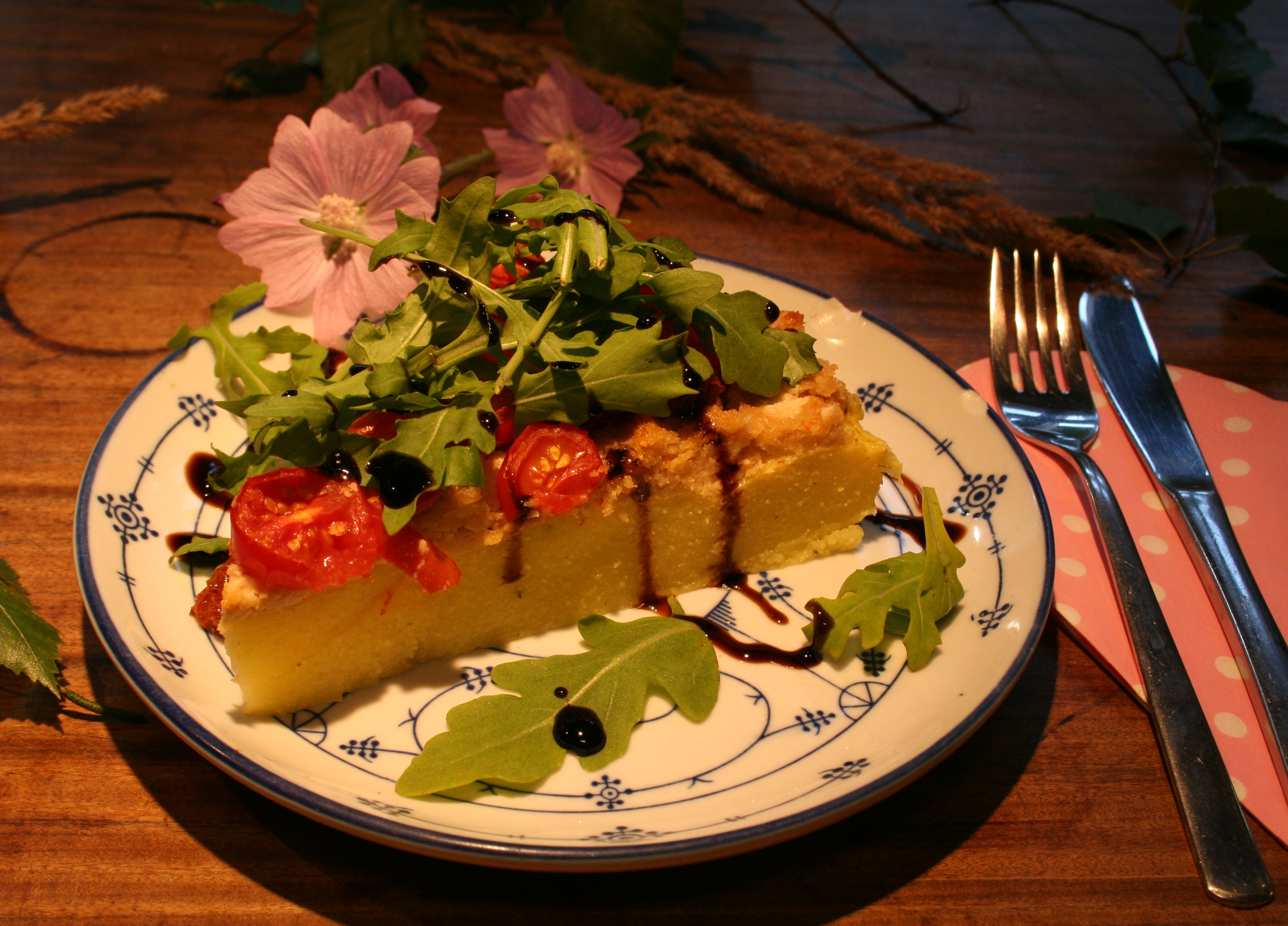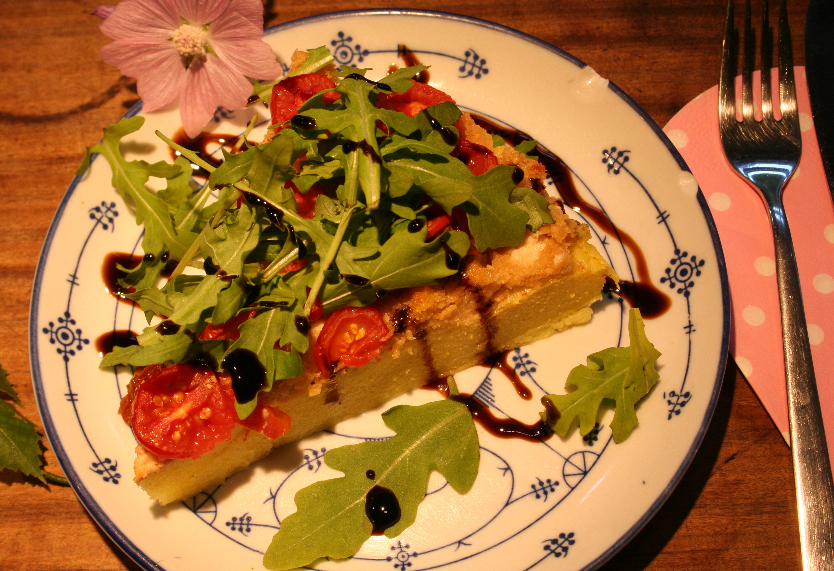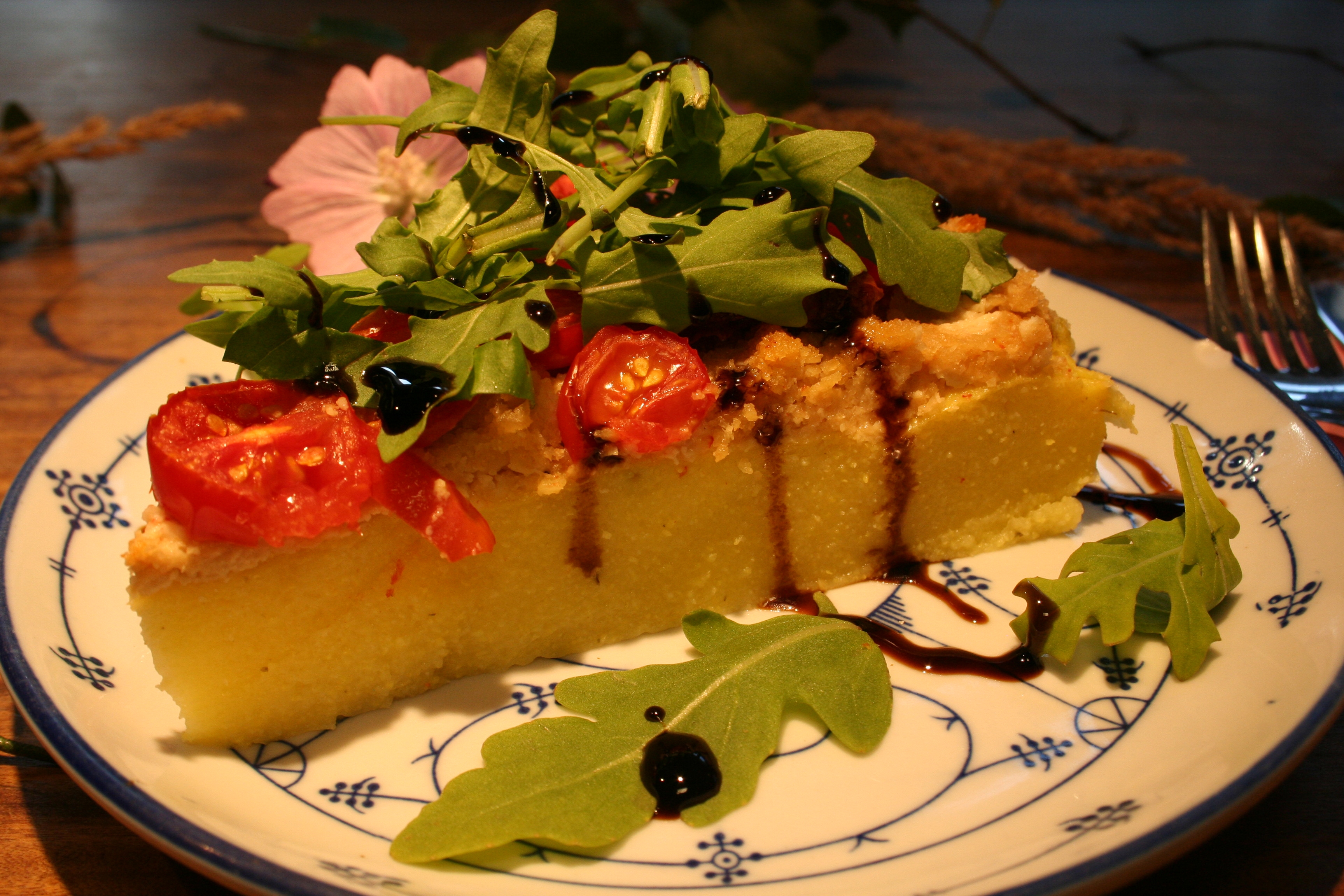 Heute gibt es eine Polenta-Tarte mit Tomaten auf veganem Ziegenkäse. Den Ziegenkäse machen wir selbst und die fertige Tarte garnieren wir mit Rucola, Basilikum und Balsamico-Creme.