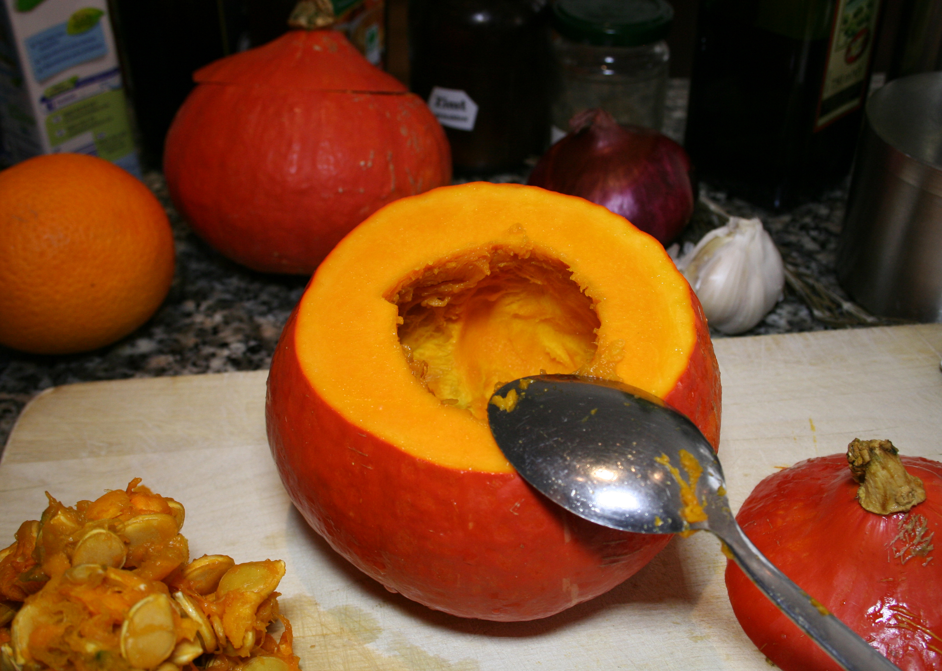 Von den Kürbissen einen Deckel abscheiden und diese anschließend entkernen und bis zum Fleisch aushöhlen.