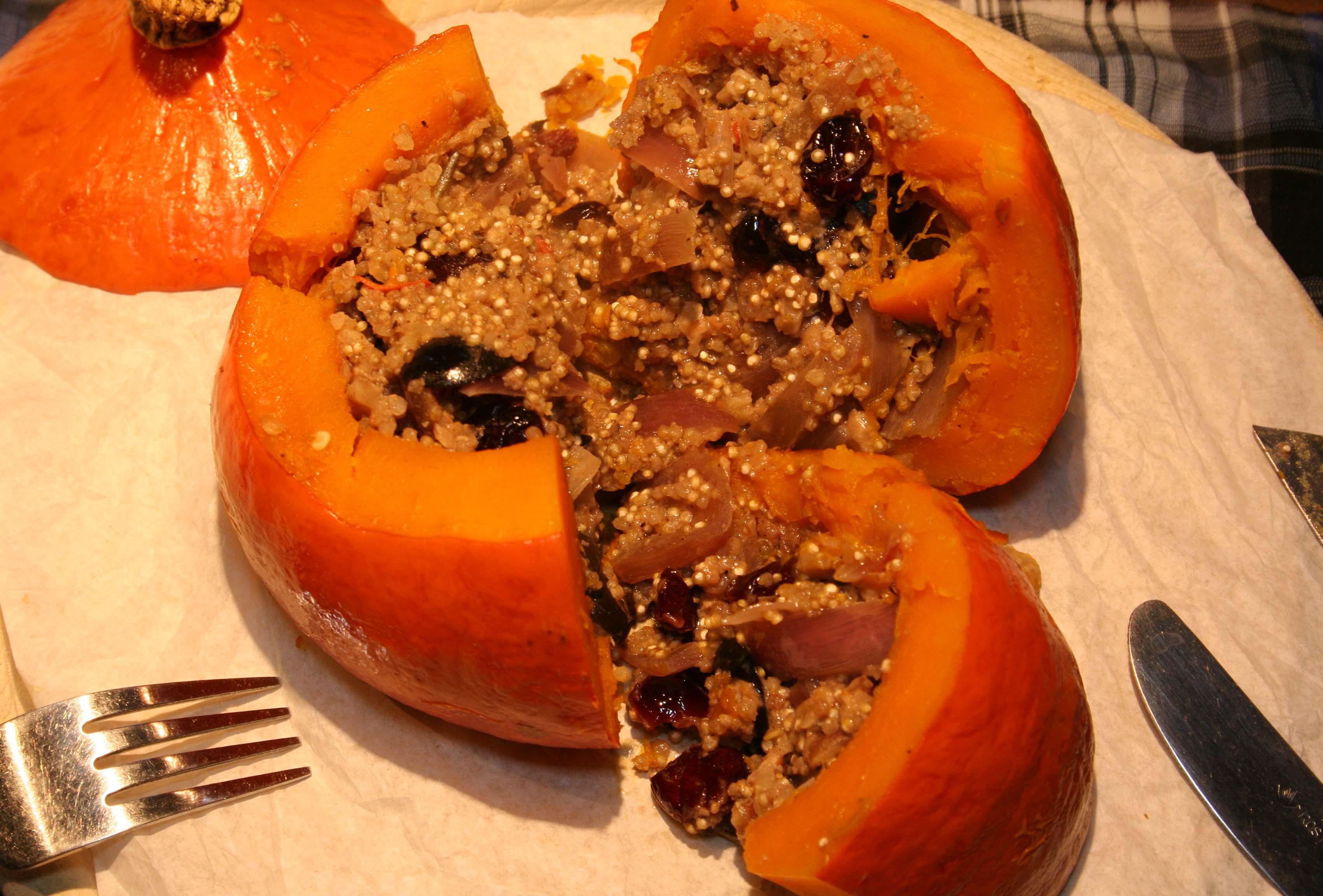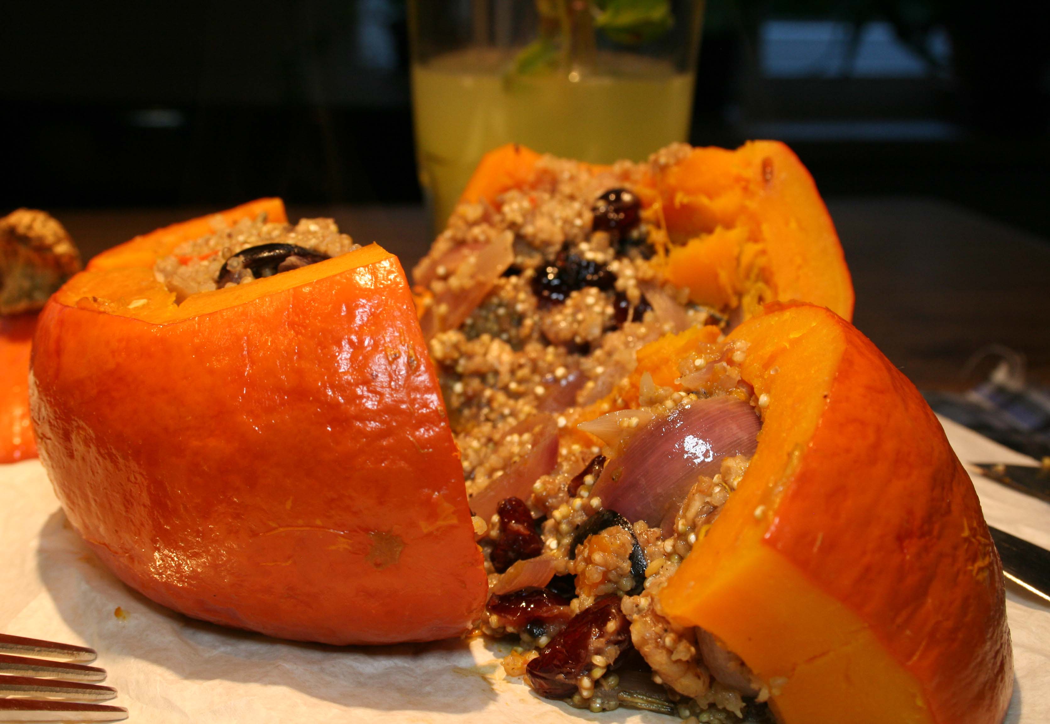 Ein super Herbstgericht: gefüllter Hokaido-Kürbis! Dampfend aus dem Ofen mit einer wunderbar gemischten Füllung mit Walnüssen, Oliven, roten Zwiebeln, Cranberries und Quinoa ist er perfekt für festliche Anlässe oder für einen schönen, kuscheligen Sonntag.