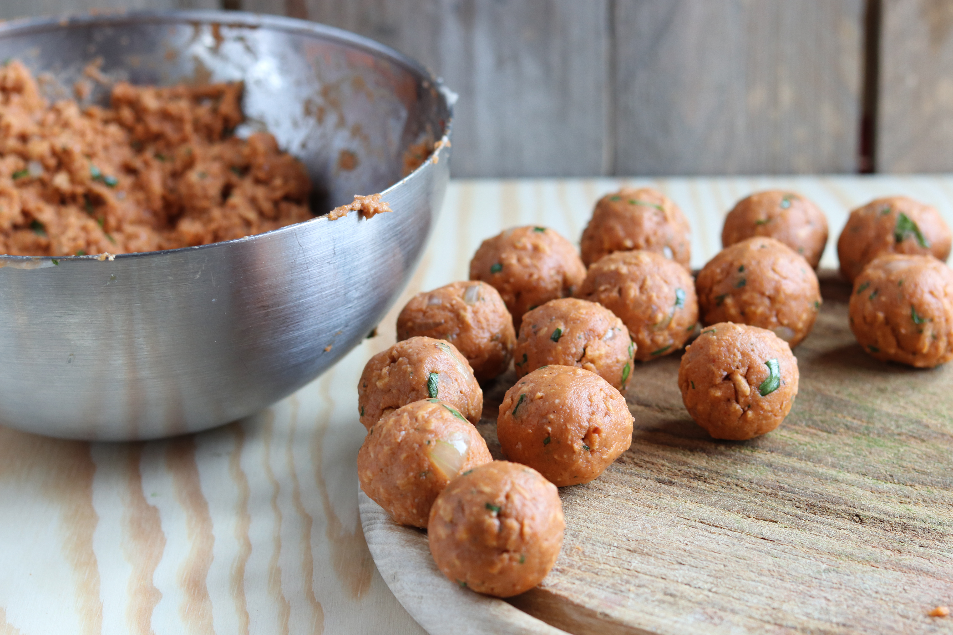 • Evtl. noch etwas mehr Paniermehl oder Wasser dazu geben, die rohen veganen Köttbullar sollten sich gut formen lassen.