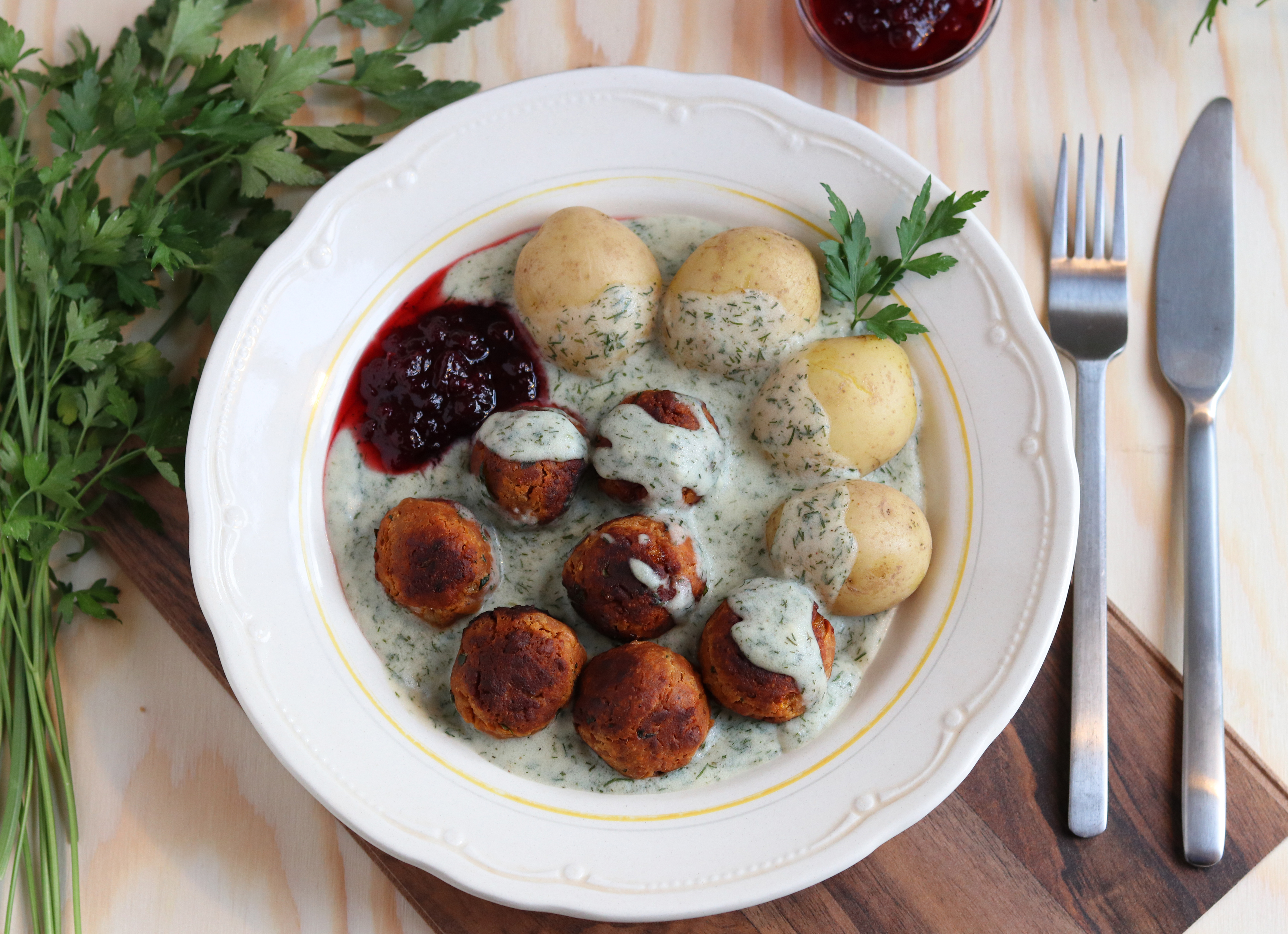 • Vegane Köttbullar mit Kartoffeln und Dillsauce anrichten und servieren: