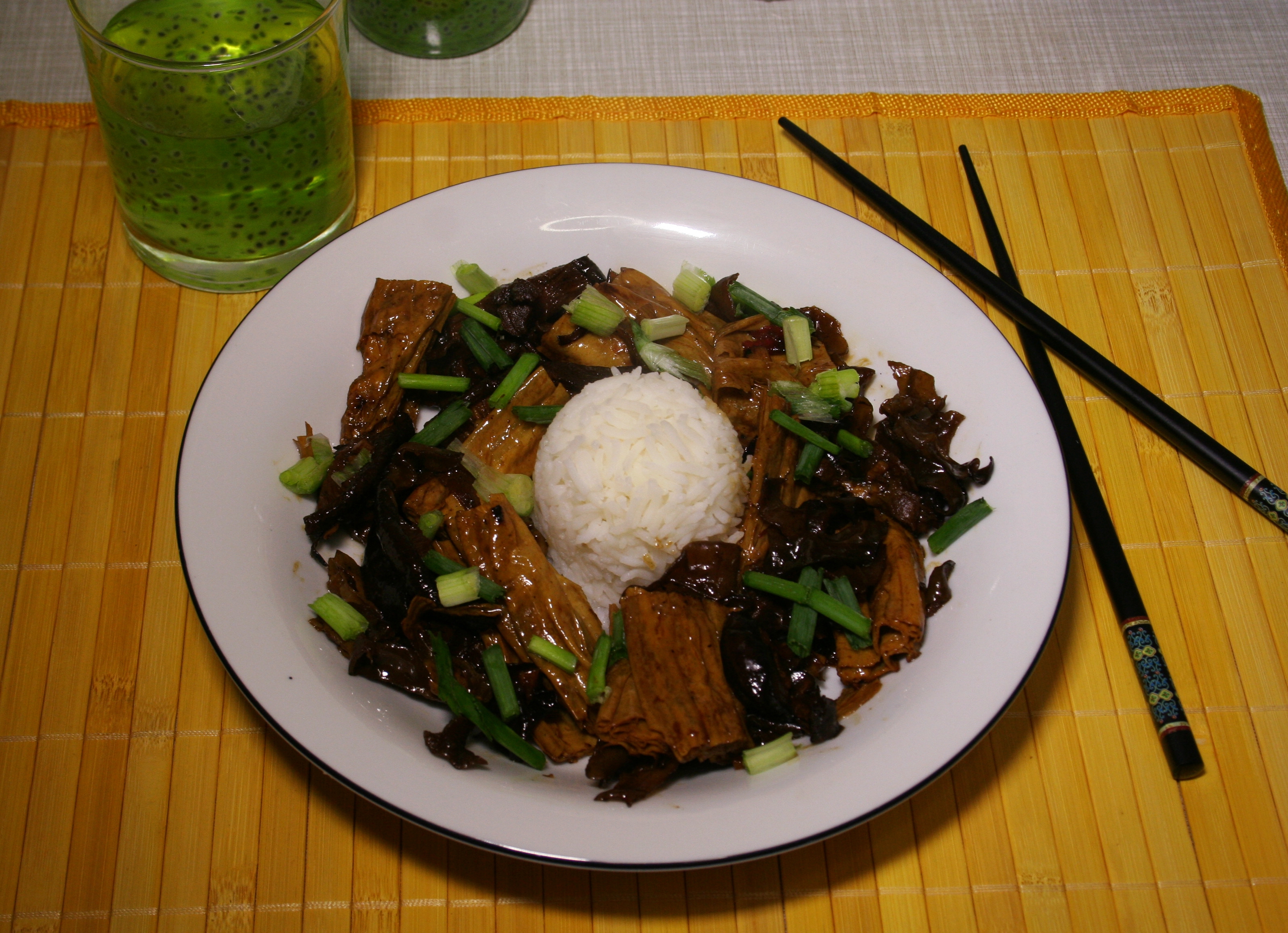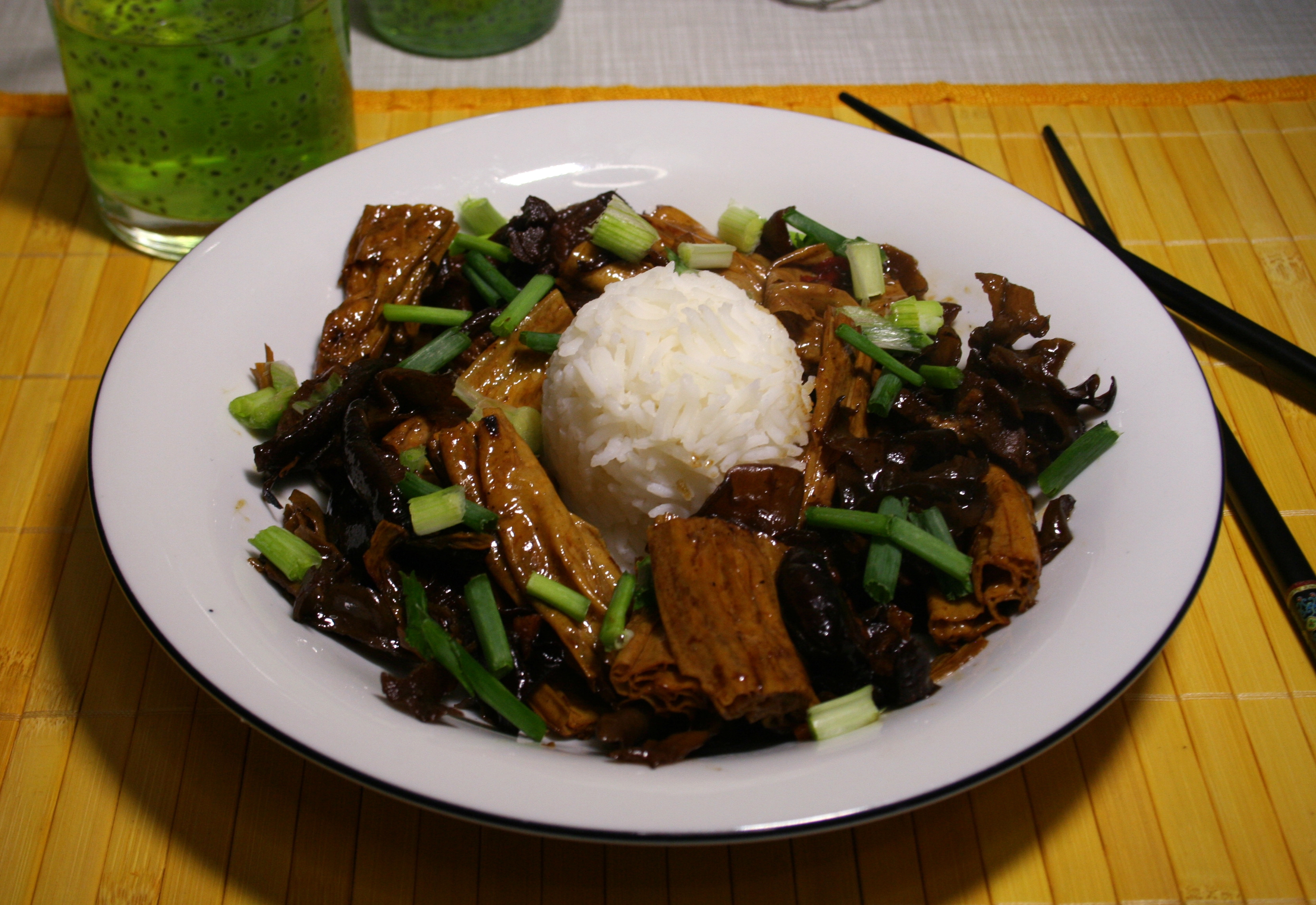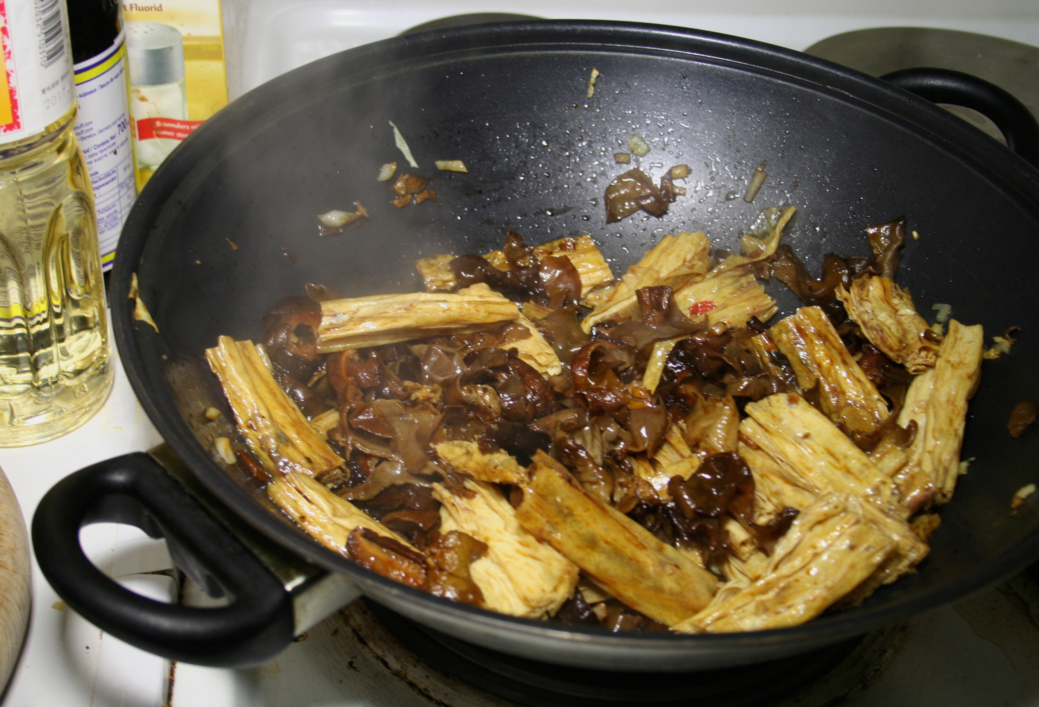 Heute gibt es im Wok geschmortes Yuba mit Pilzen.