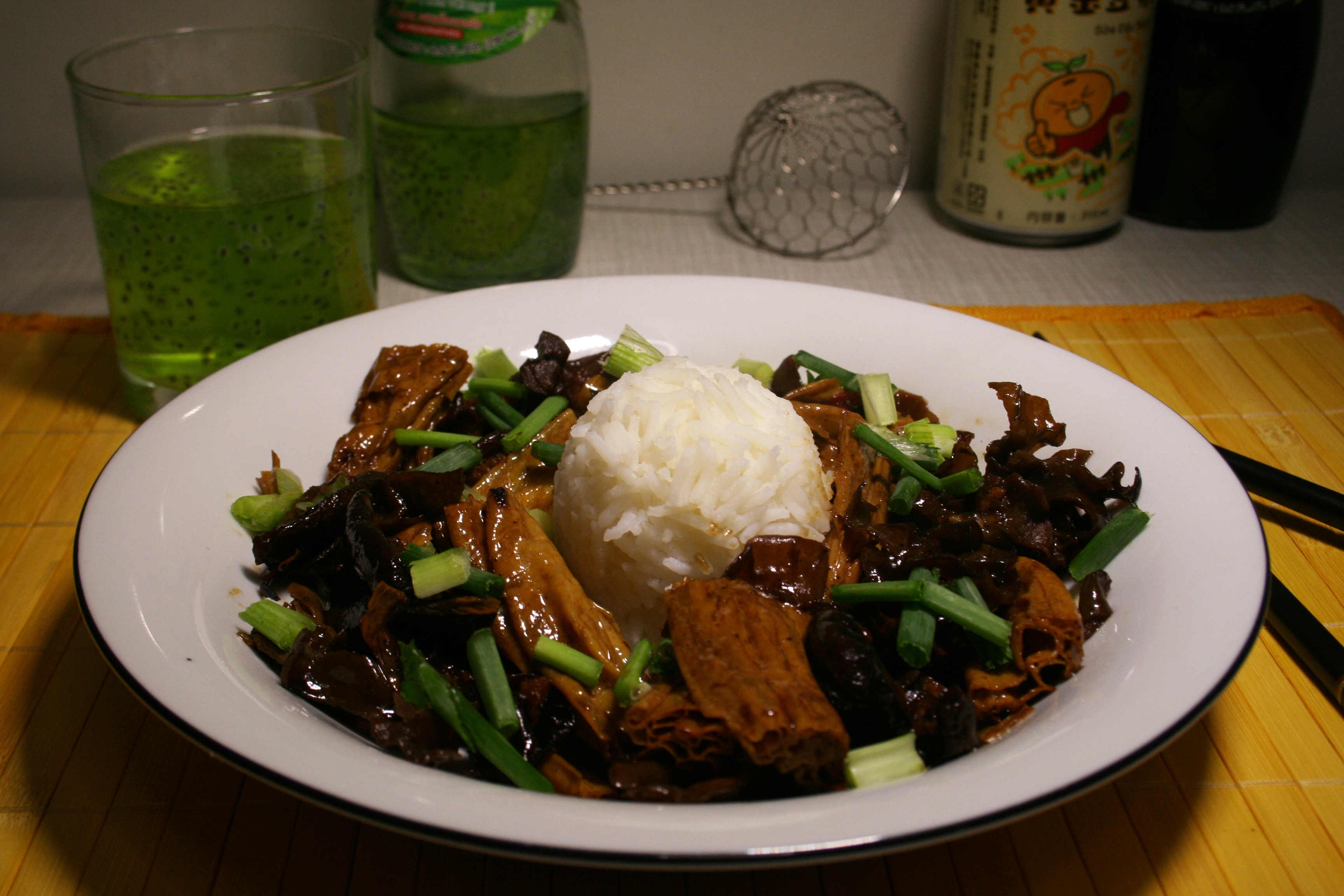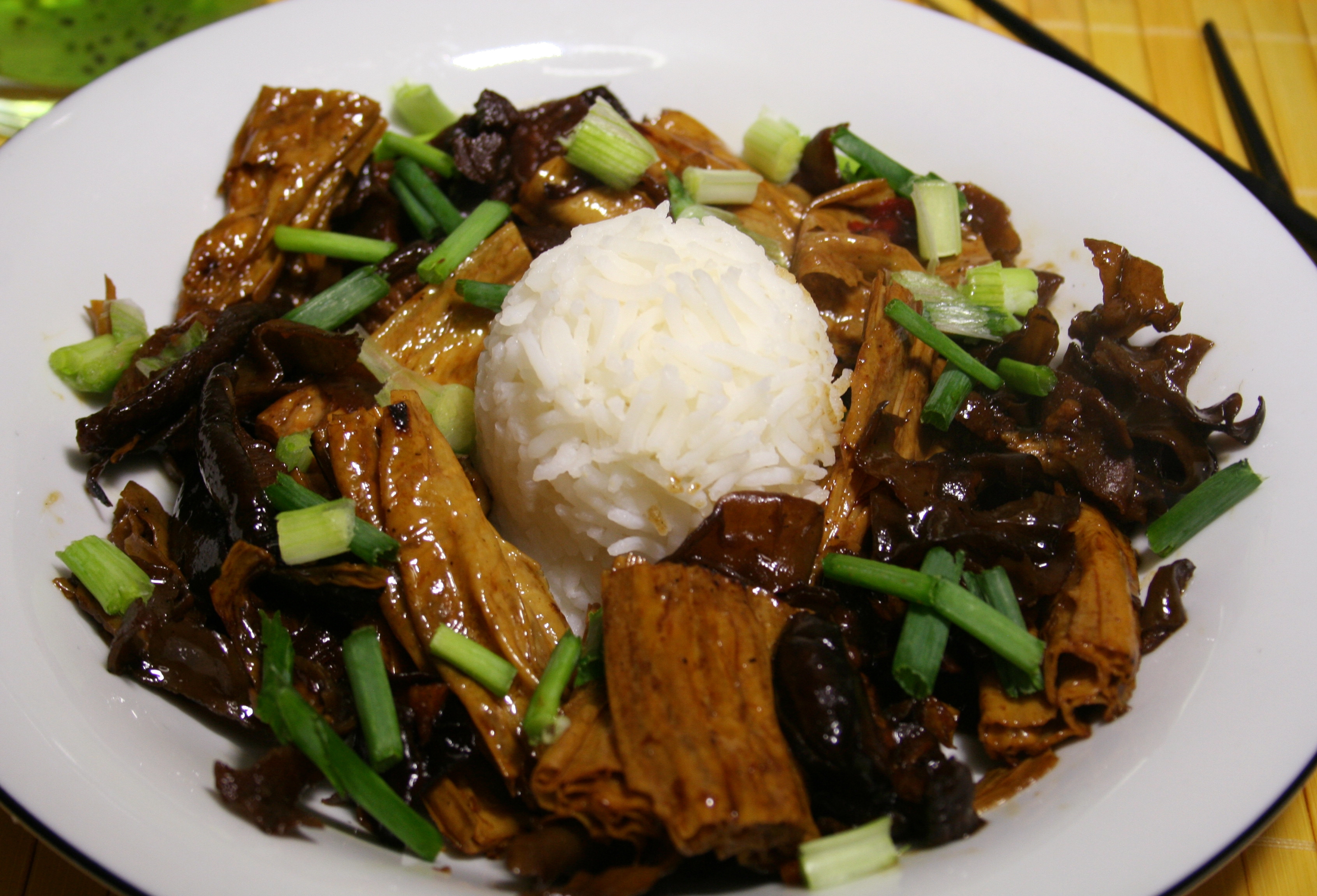 Typisch für viele chinesische Gerichte, sind die Hauptzutaten vor dem Zubereiten getrocknet. Die Hauptzutat dabei ist Yuba, auch Soy Bean Curd Skin, Sojabohnenhaut oder Tofu Skin genannt. Diese wird lecker mit asiatischen Pilzen geschmort.