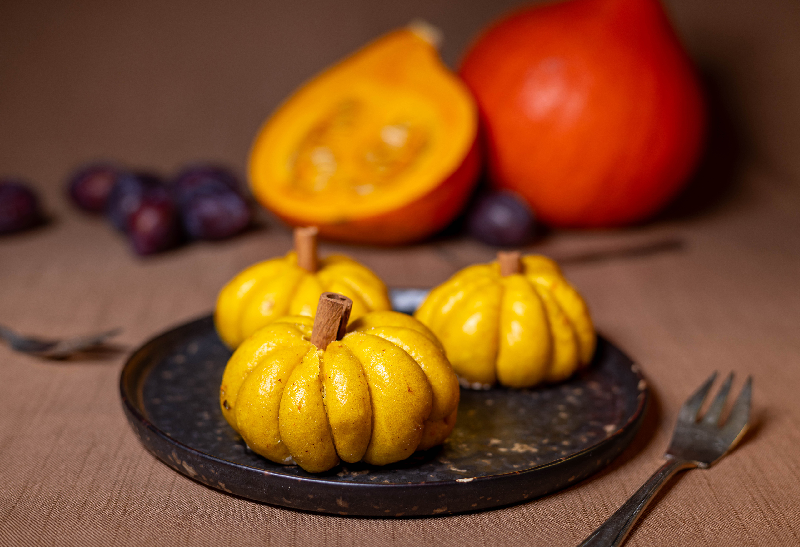 Kürbisse kann man herzhaft und süß zubereiten. Hier als süße Kürbisbrötchen mit Zwetschenfüllung.