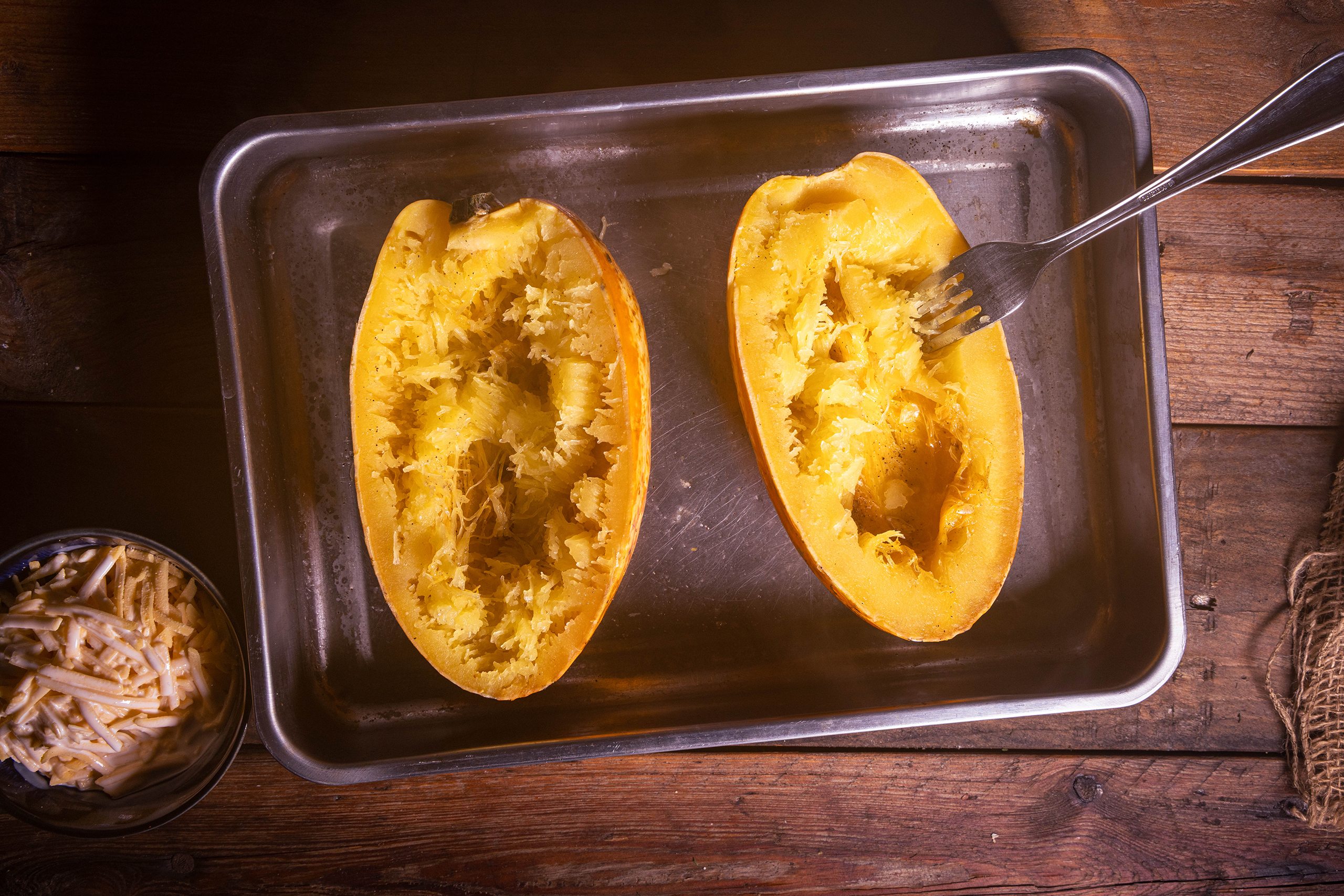 • Die Kürbishälften aus dem Ofen holen und mit einer Gabel die Fasern des Kürbis auseinander ziehen, so dass die gewünschten Spaghetti entstehen.