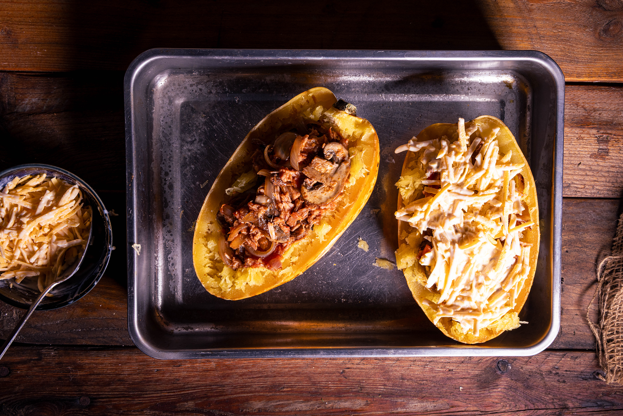 Überbackener Spaghettikürbis gefüllt mit deftigem Pulled-Jackfruit-Pilz-Ragout, darauf noch eine cremig-krosse, vegane Käsekruste.
