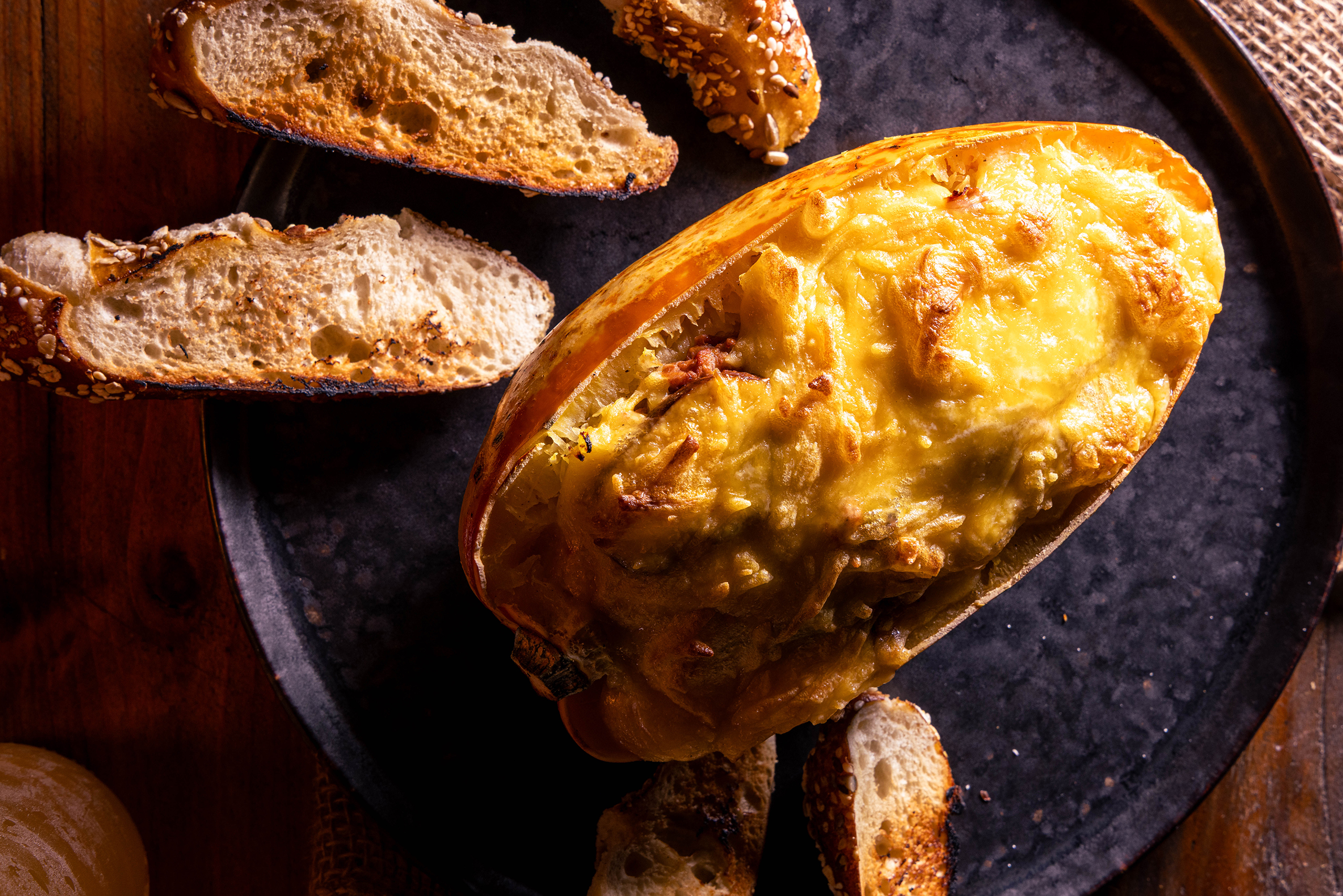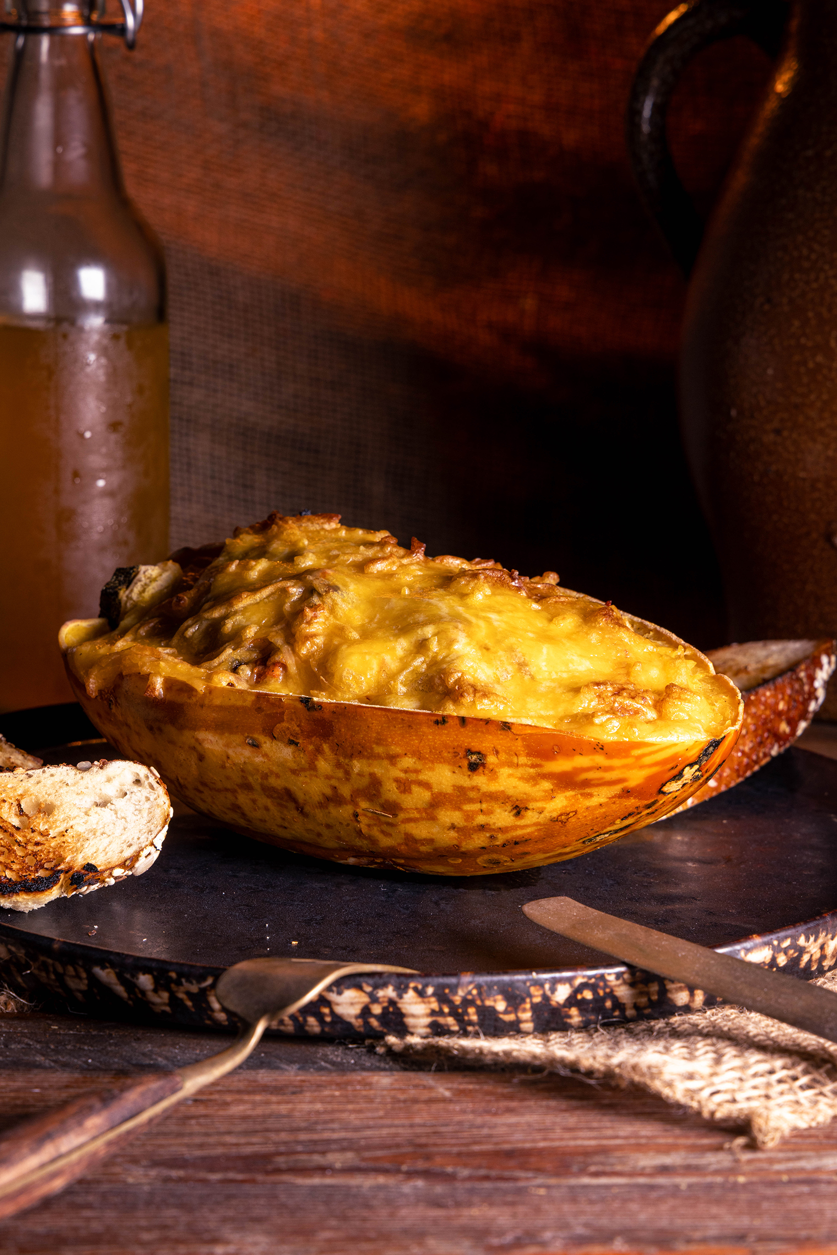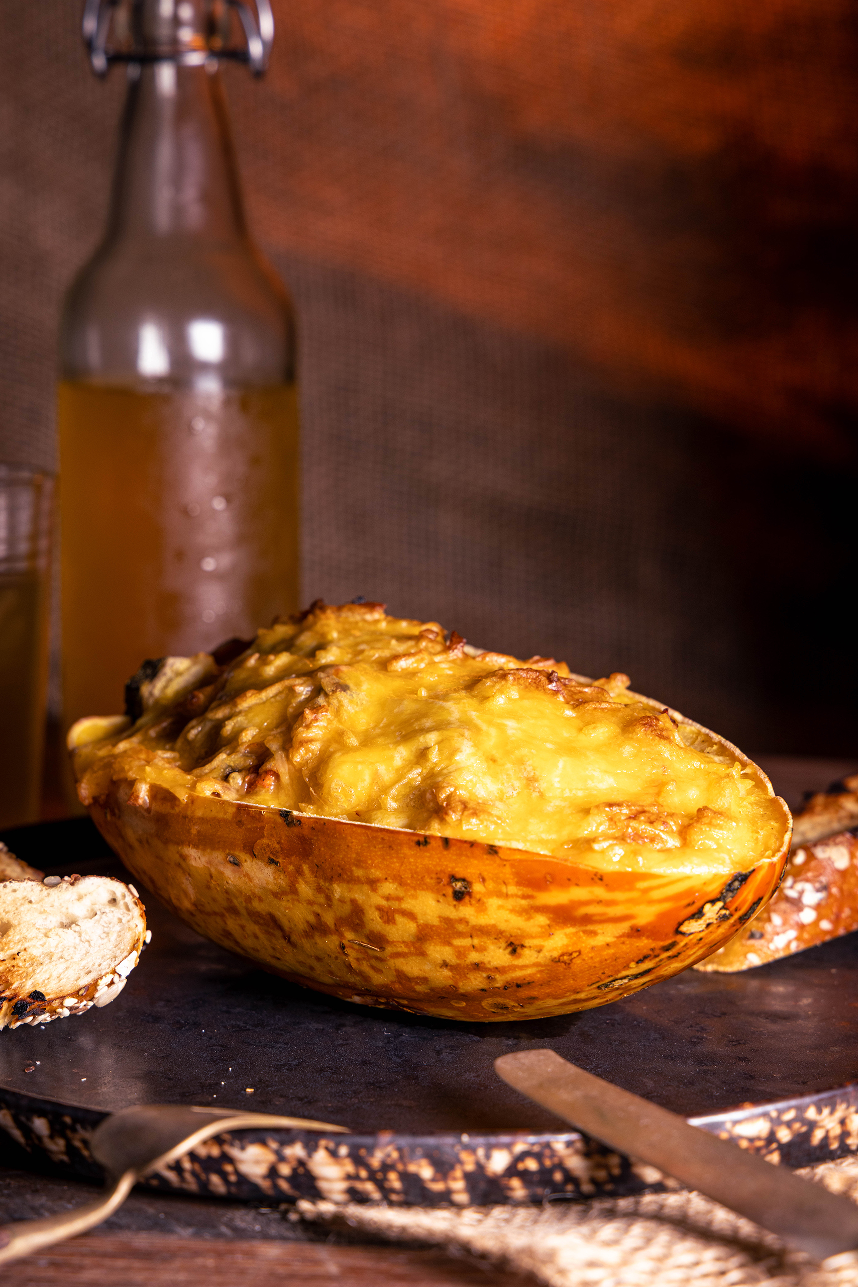 Kürbis wird mit Pulled-Jackfruit-Ragout und einer Käsekruste gefüllt.