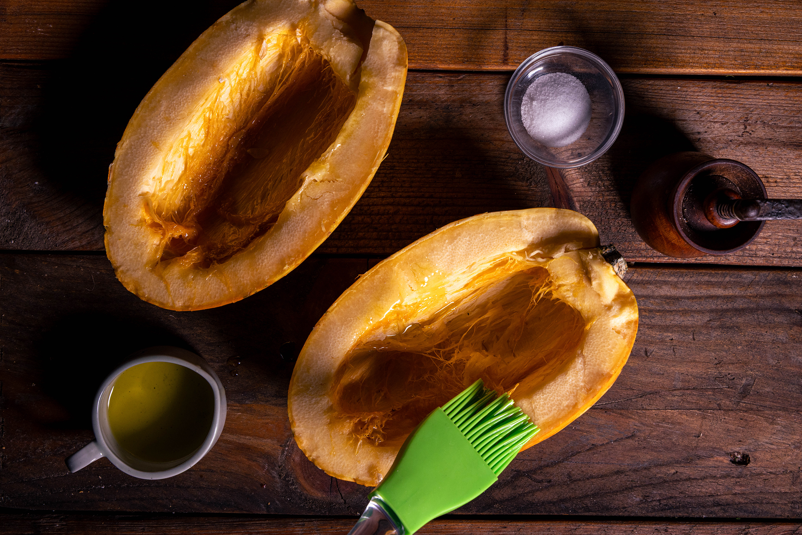 Zwei Spaghettikürbishälften, Öl, Salz, Pfeffer. Eoine Kürbishälfte wird mit Olivenöl bestrichen.