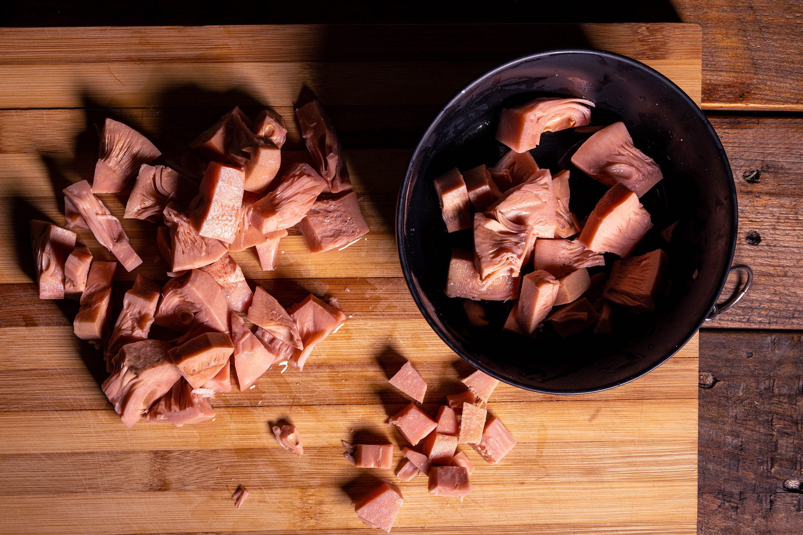 4. Die harten Ecken von den Jackfruitstücken abtrennen und klein schneiden.