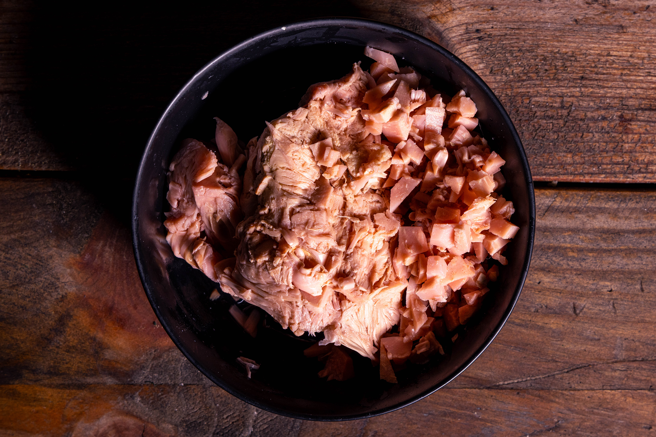Ausgedrücktes Jackfruitfleisch in einer Schale.