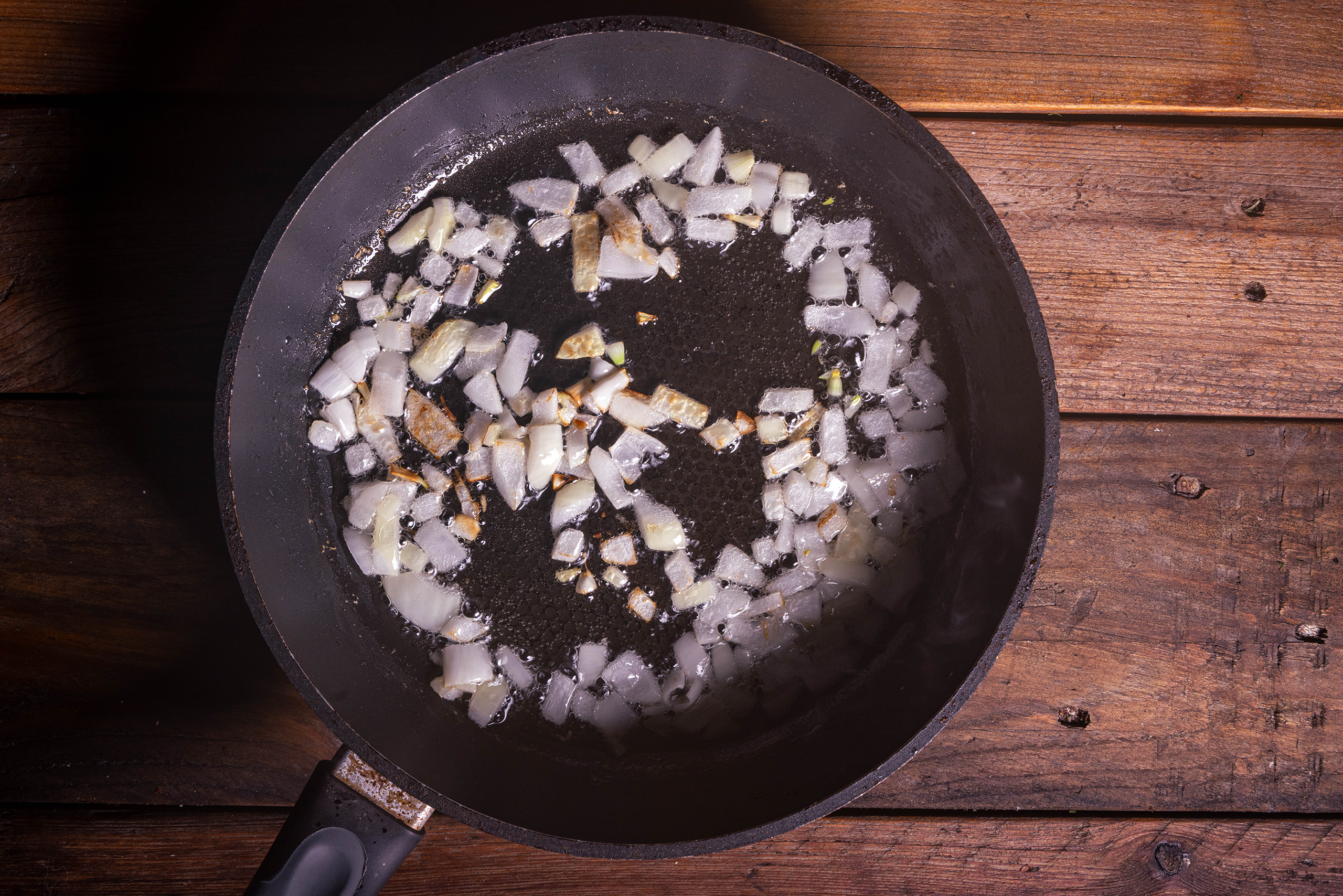 6. Die gewürfelten Zwiebeln in einer Pfanne glasig braten.