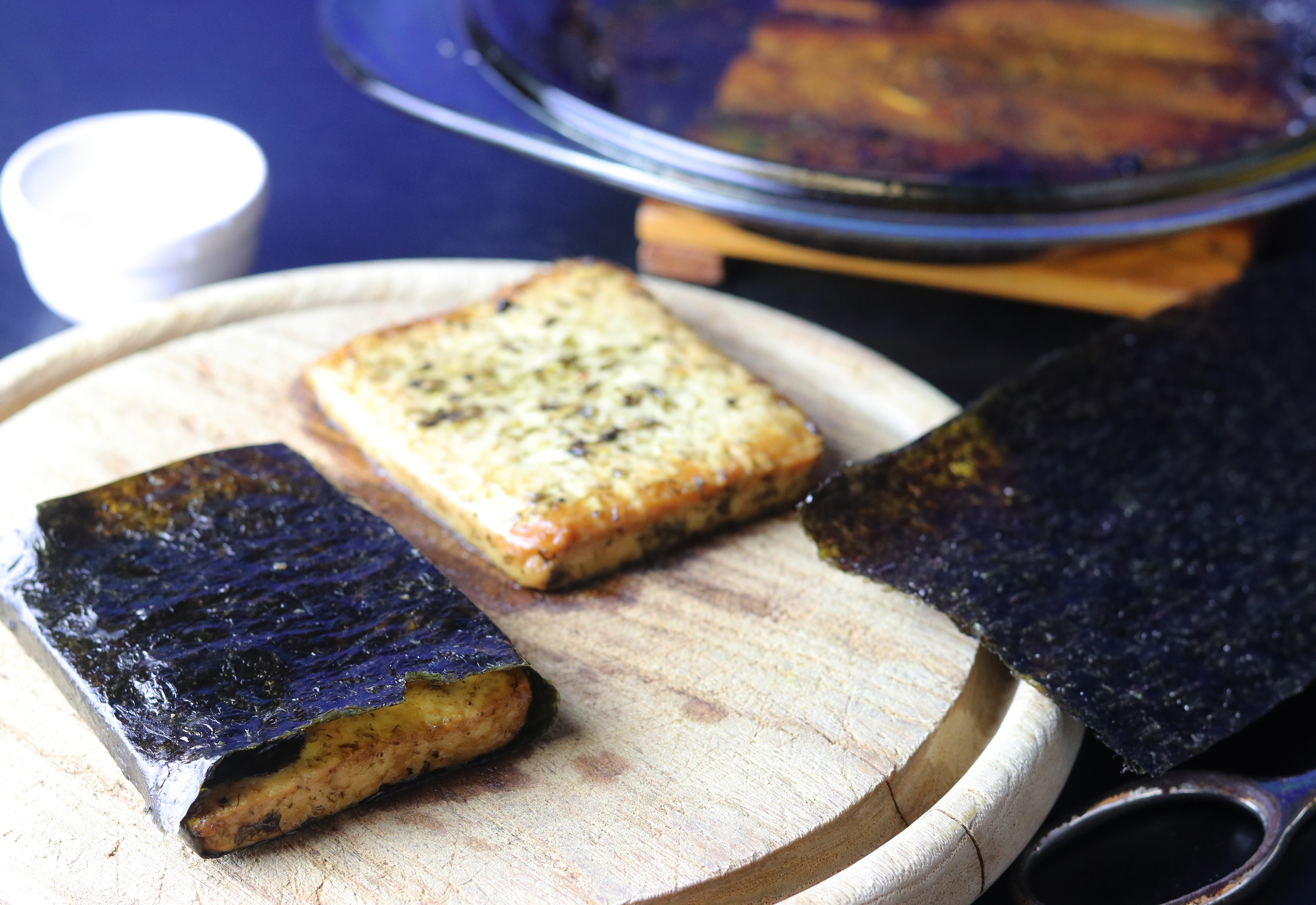 - Das Noriblatt mit einer Schere halbieren und die Tofuscheiben in je einer Hälfte des Blattes einwickeln. Das Noriblatt am Ende mit etwas Wasser zusammenkleben.