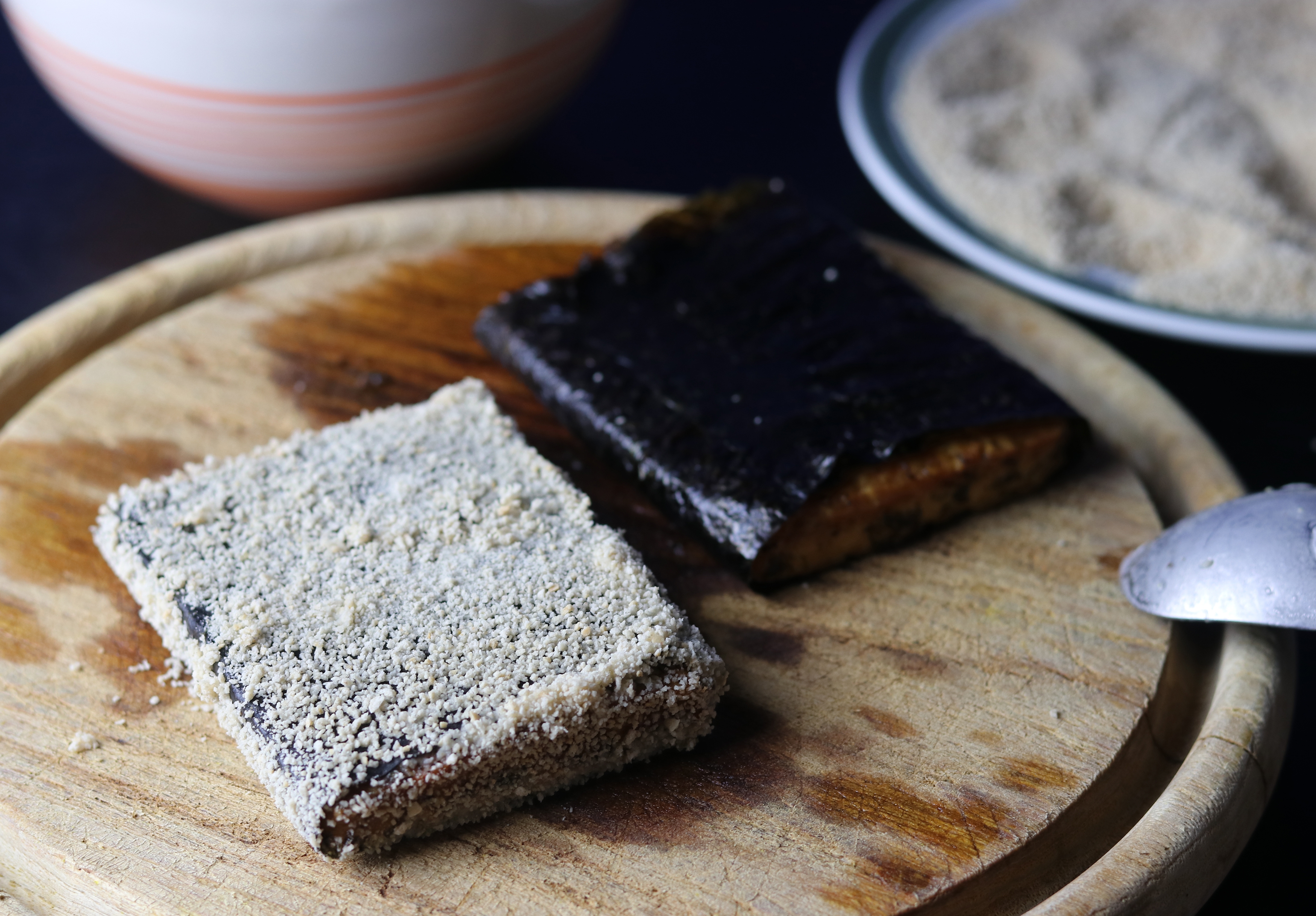 - Die Tofuscheiben in das angerührte Kichererbsenmehl tunken, bis sie überall damit bedeckt sind. Dann in Paniermehl wenden. Wenn Du, so wie ich, dicke Panade liebst, tauche den BackVisch erneut in die flüssige Panade und wälze ihn ein zweites Mal im Paniermehl.