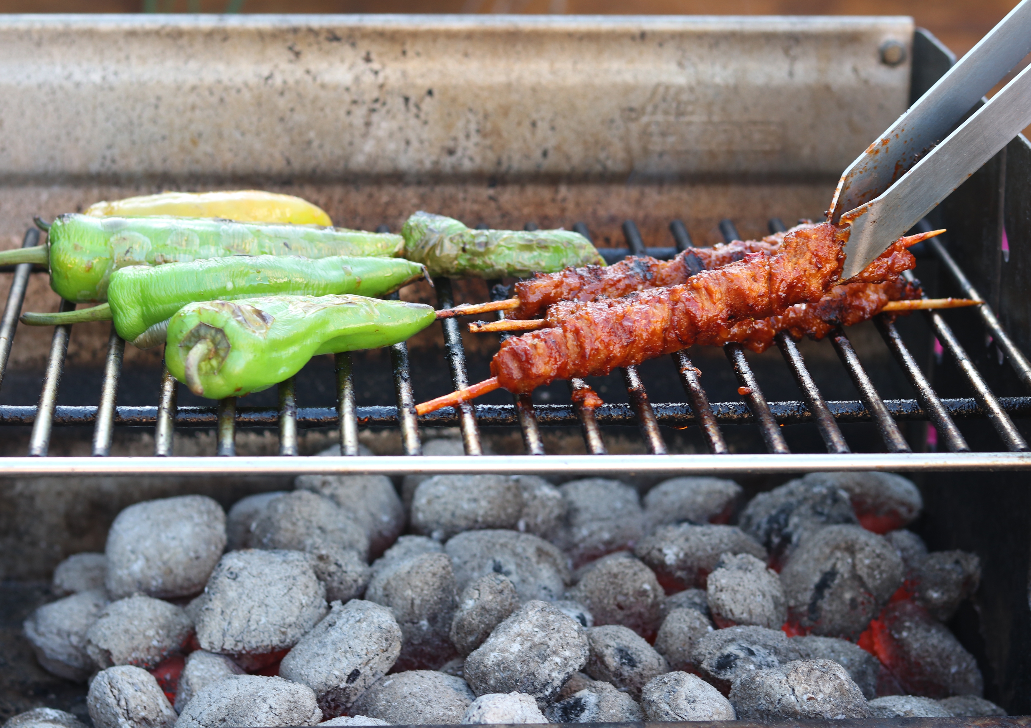 3. Wie das brutzelt! Untger häufigem Wenden und nicht allzu großer Hitze werden die Grillfackeln auf dem Kohlegrill zubereitet.