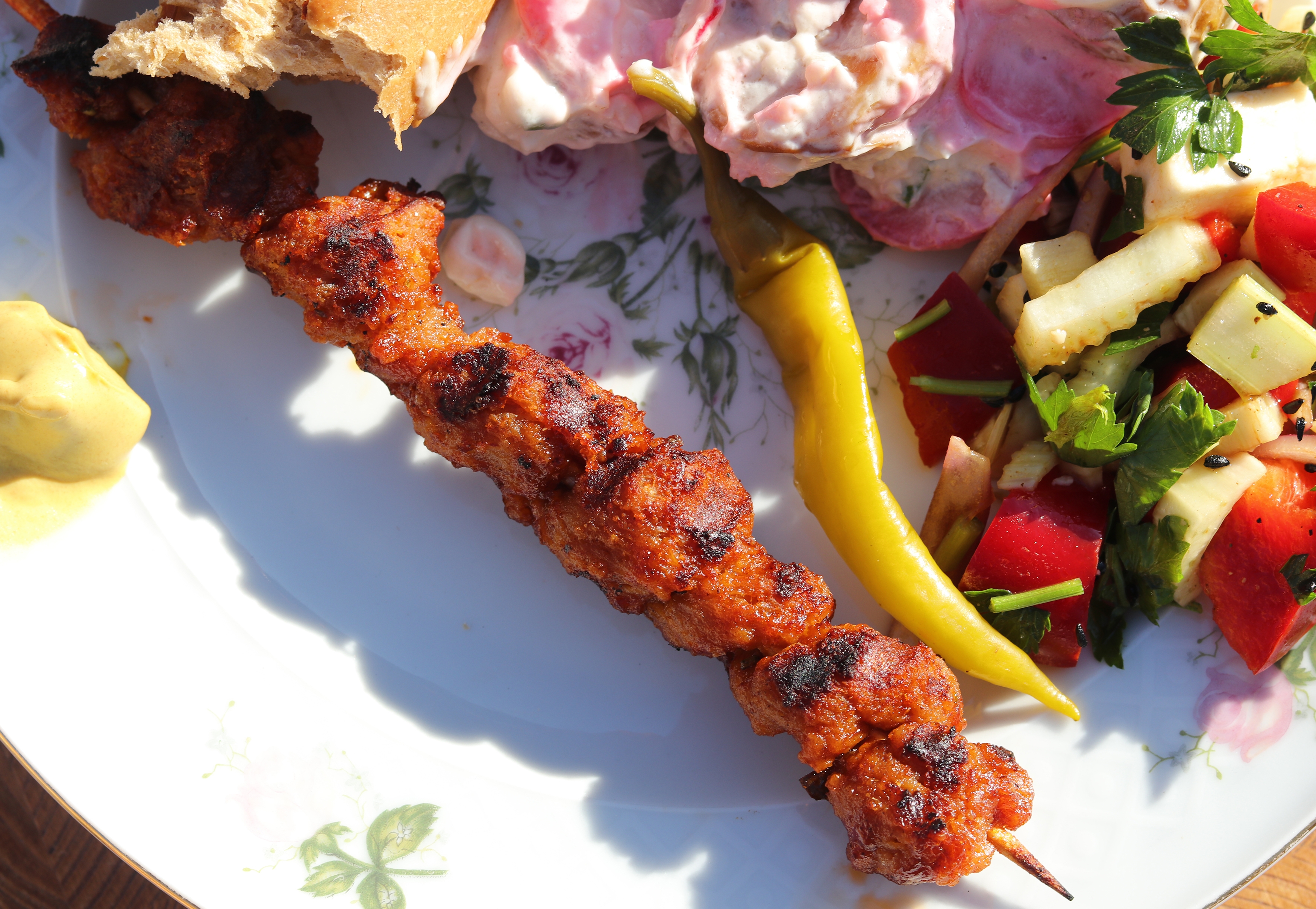 Vegane Grillfackeln schmecken, wie die aus Schweinefleisch, sehr gut mit allerlei Dips: