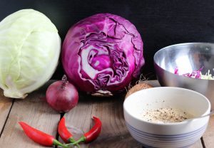 Mix the cabbage with the onions and red chilli. In another bowl mix the mayonnaise with mustard, apple cider vinegar, lemon juice, sugar, celery salt and chilli sauce. Add the dressing over the salad, mix well and season with salt and pepper.