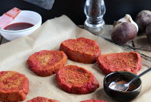 Mix all the spices together for the rub. Rub the seitan patties generously on both sides.