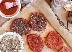 Mix the BBQ sauce with the liquid smoke and red wine. Brush the patties generously with this sauce. Then turn them in the coarsely ground pepper.