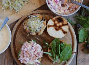 Place the salad leaves and coleslaw on the lower halves. Put the cheeseburger patties on top. Add a rich dollop of creamy mustard sauce and garnish with fresh sprouts, before you add the upper half of the bun.