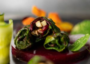 Gebratene Beeteblattröllchen aus frischen Rote Beete Blättern, gefüllt mit angebratenen Kräuterseitlingen und Zwiebeln. Heiß serviert auf kalter, beschwipster Beete-Portwein-Gelee. Anbei gerollte, säuerliche Gurke und Wasabiluft.