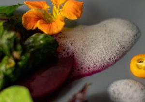 Der Wasabischaum verströmt seinen leicht scharfen Duft, welcher herrlich zu den erdigen Aromen der Beete und der Kräuterseitlinge passt. Mit der Note des Portweins, der Säure der Kumquats und den Würzen der Kressearten, ergibt sich hier eine wunderbare, leichte Vorspeise. Sie öffnet den Magen und schreit nach mehr.