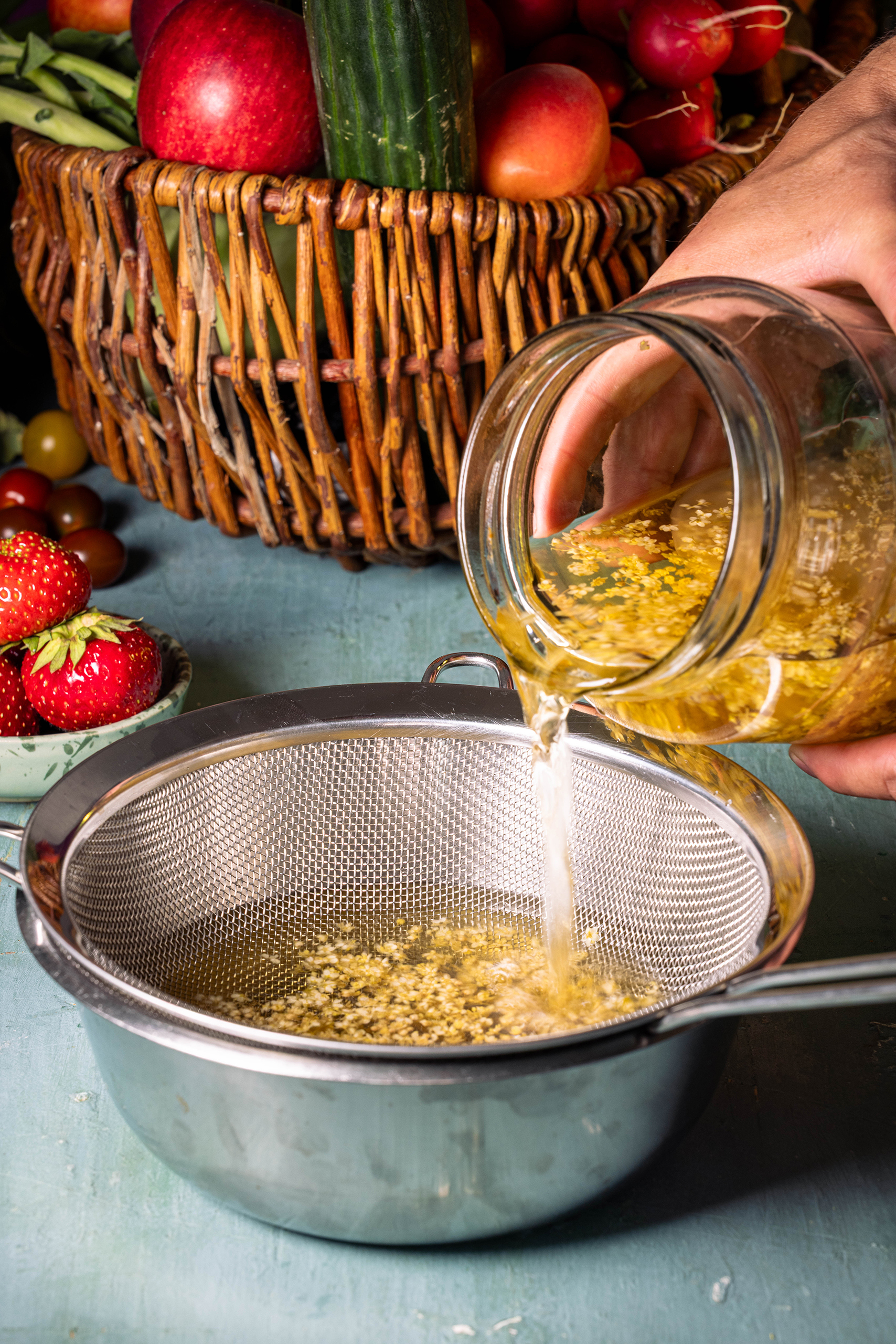 - Den fertigen Holunderblütenessig dann durch ein Tuch oder ein sehr feines Sieb abseihen.