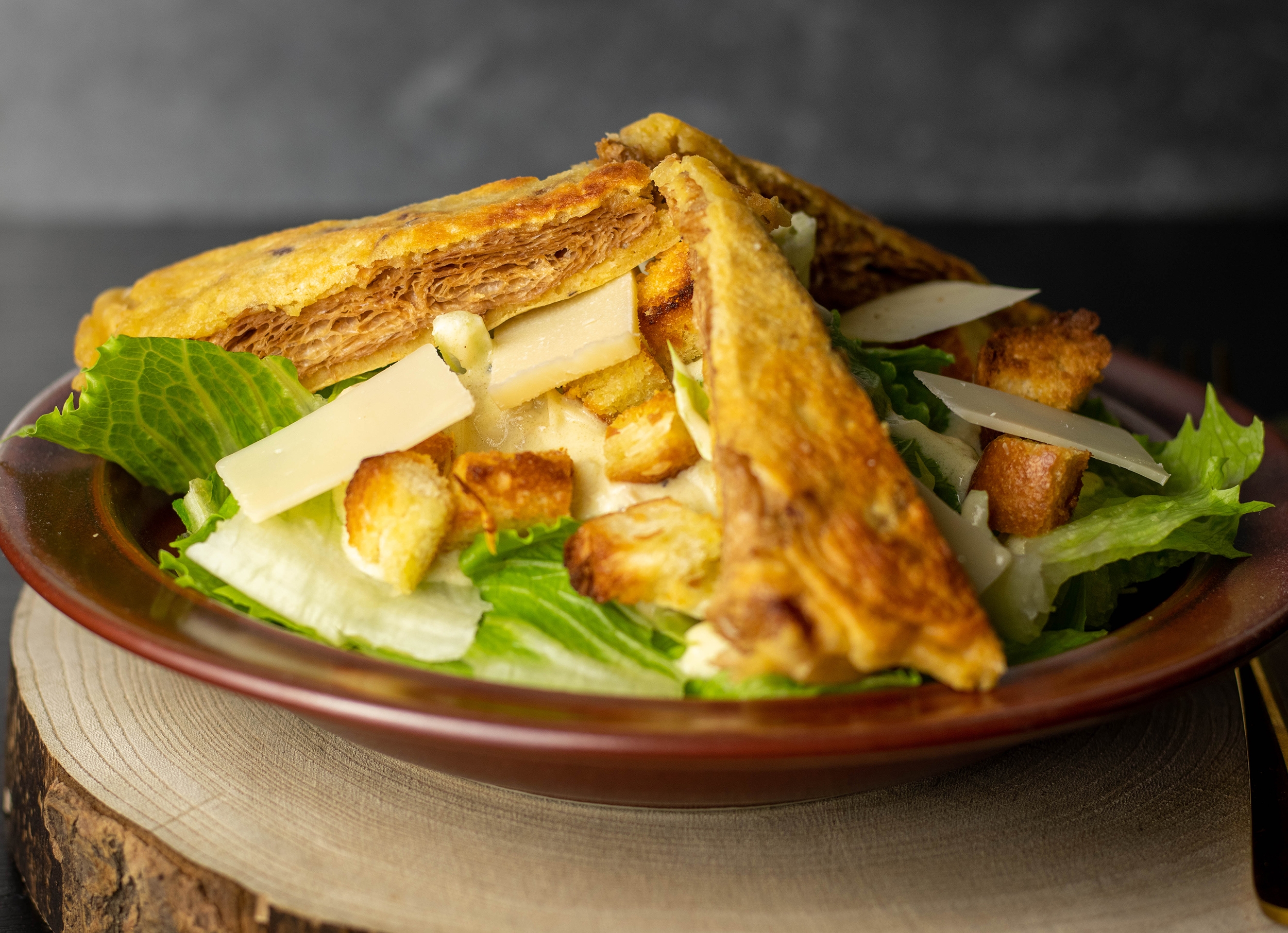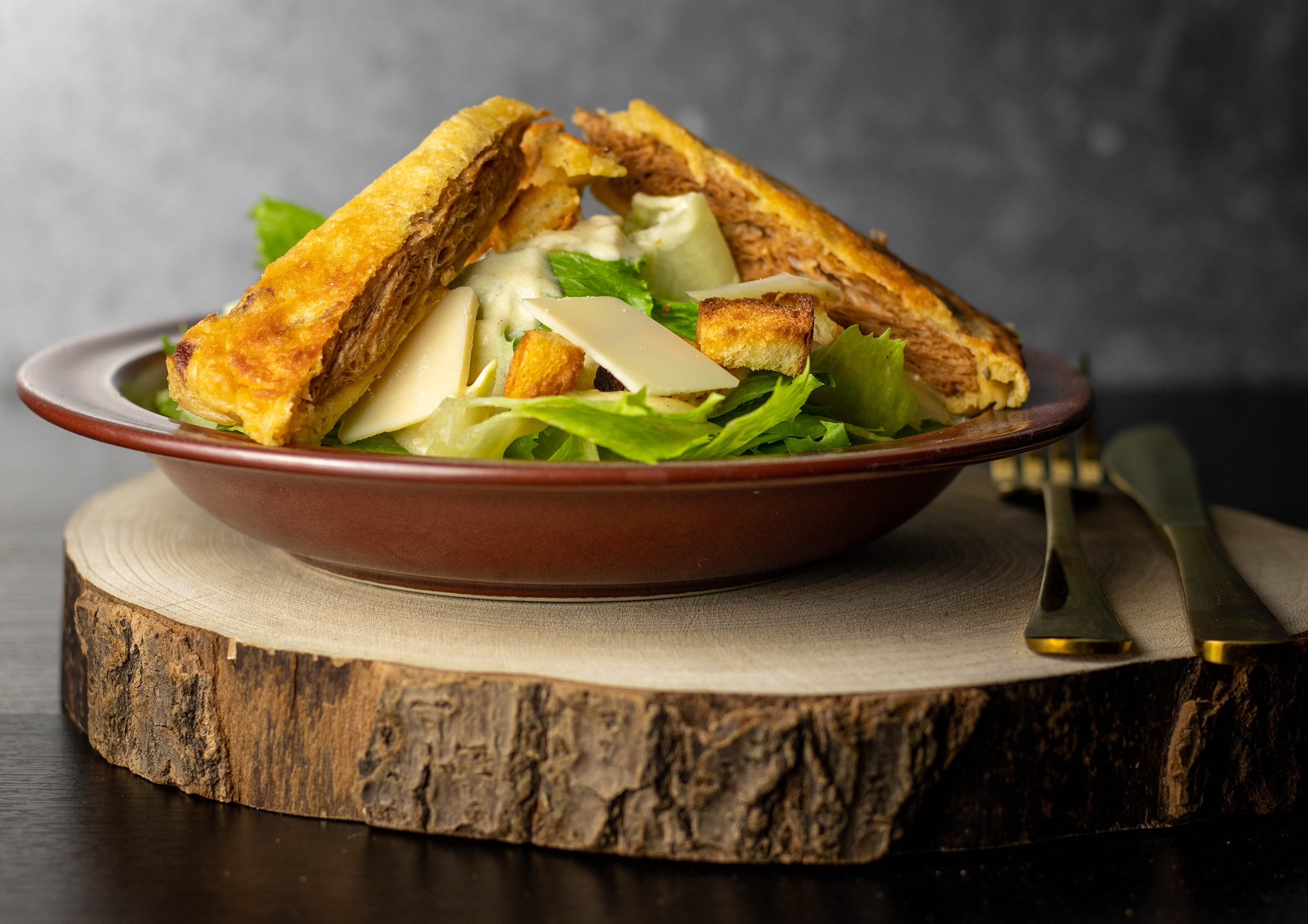 Deftig paniert und kross gebraten. Ein saftig-herzhafter Kontrast zum knackigen Salat und cremigen Dressing.