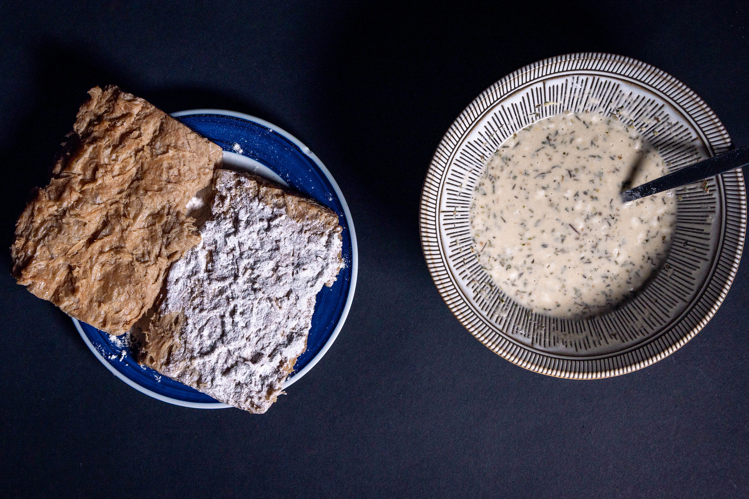 Vegane Big Steaks werden in Mehl gewendet. Daneben eine Schale mit flüssiger Panade.