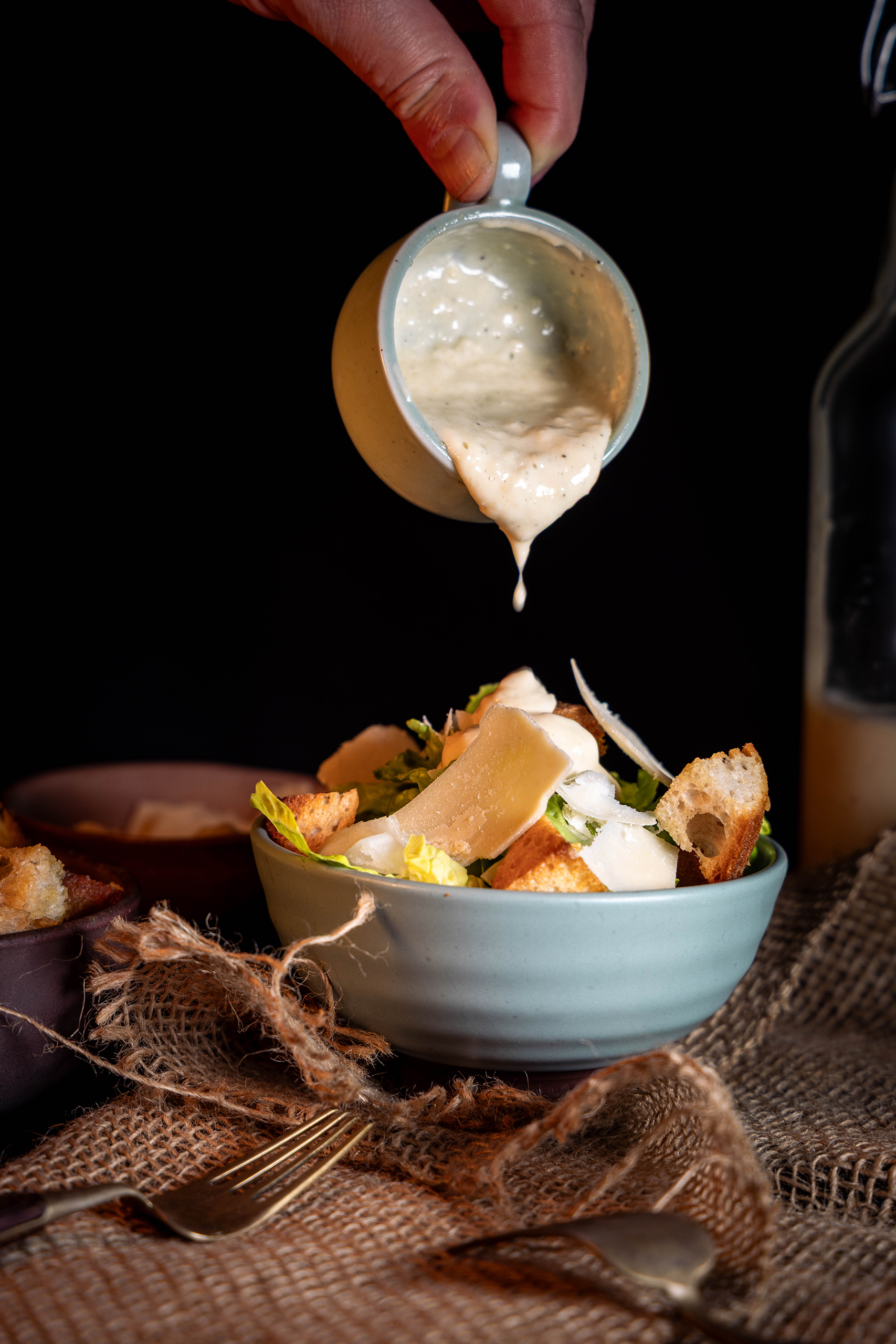 Veganes Caesar Dressing wird auf einen Salat gegeben.