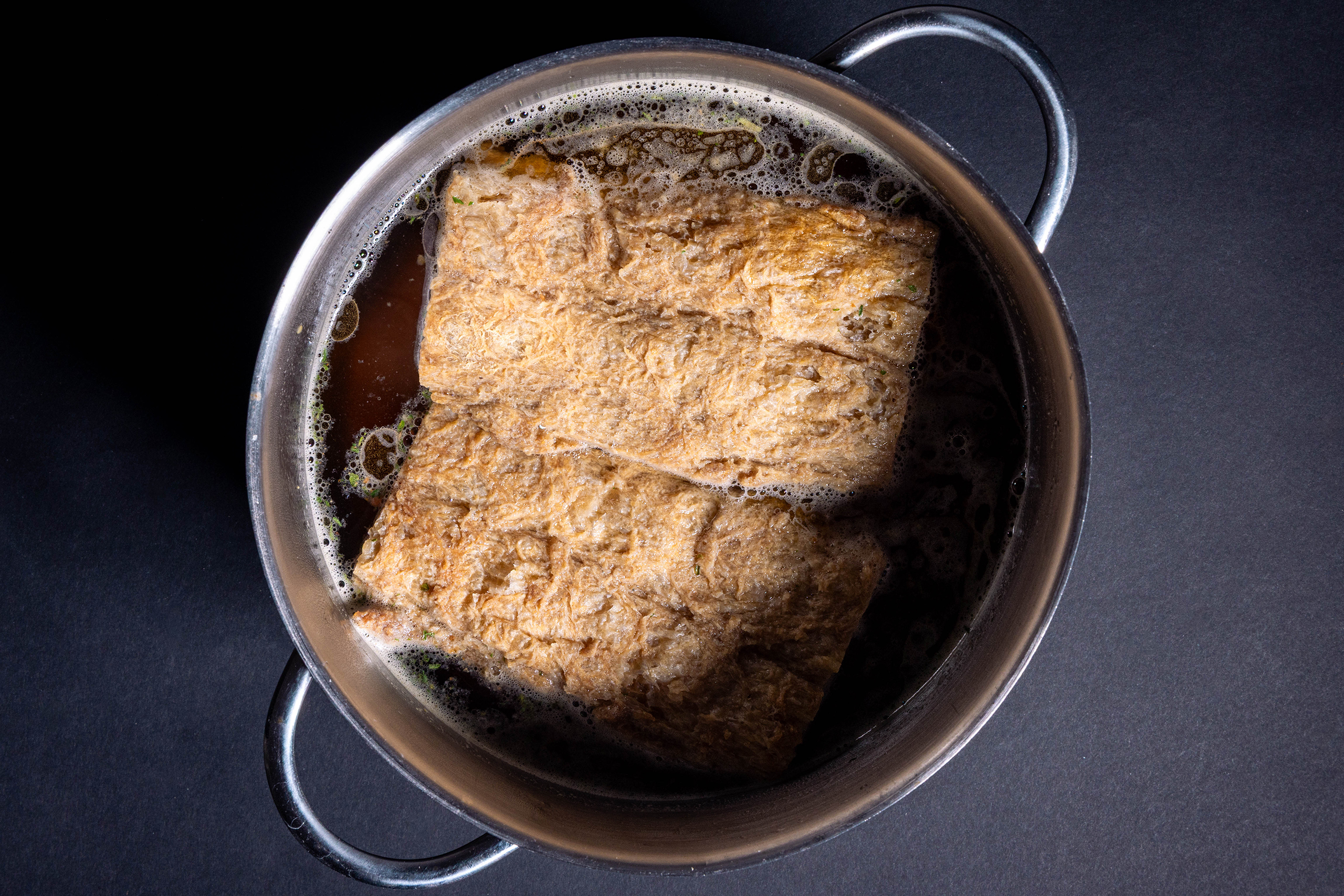 2 Soja Big Steaks garen in einem Topf mit gewürzter Brühe.