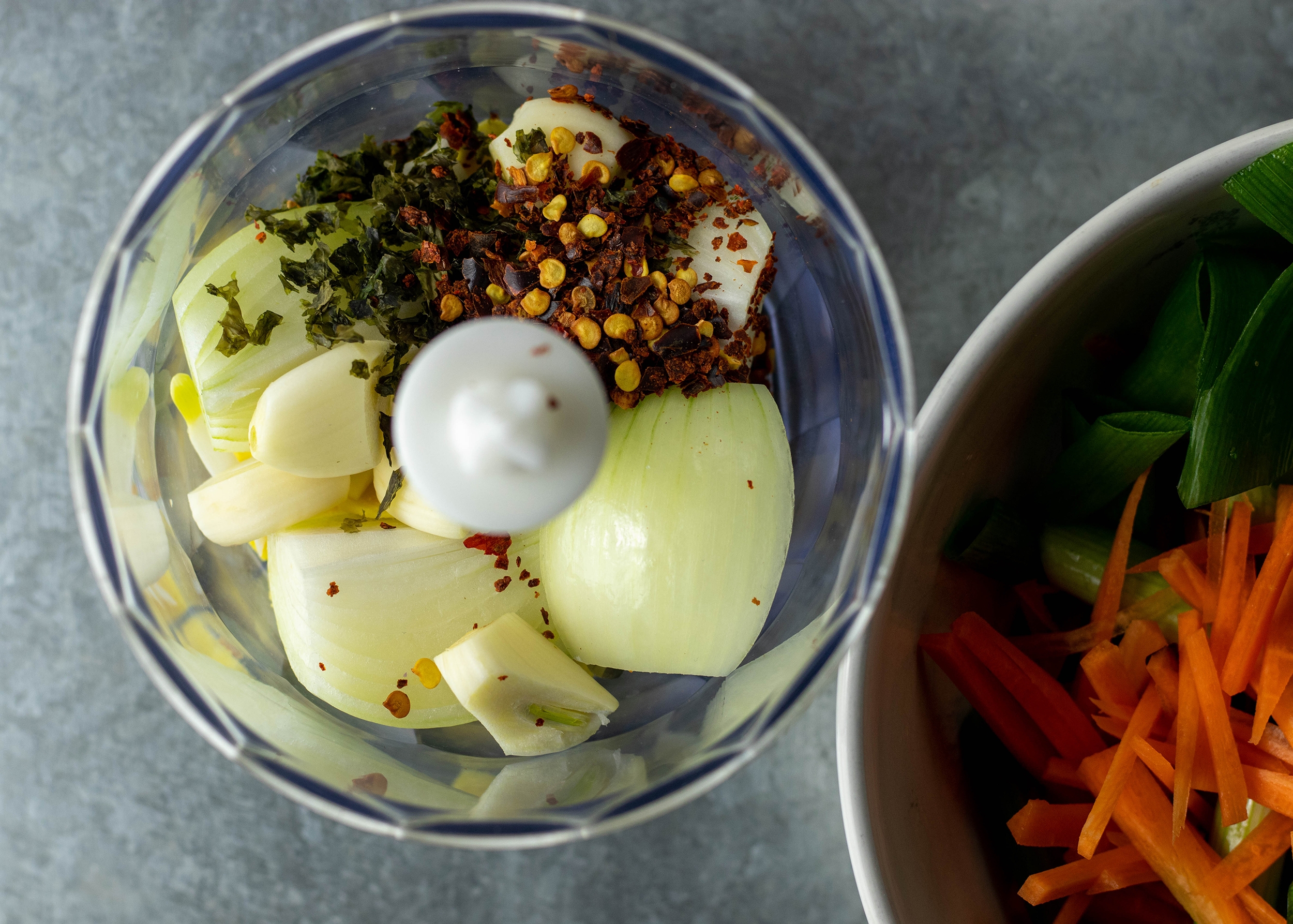 - Zwiebel, Knoblauch, Ingwer, Chiliflocken und Noriflocken mit der Sojasauce und der Misopaste in eine Küchemaschine geben und fein mahlen, so dass eine homogene Würzpaste entsteht.