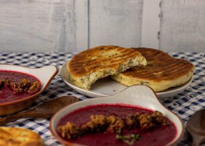 Die Suppe auf tiefe Teller oder Schüsseln verteilen und Hafer Mandel Streusel darauf geben. Mit dem Pfannenbrot als Beilage servieren.