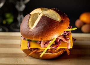 Nun die Pulled Pilz Burger belegen. Dazu die Laugenbrötchen aufschneiden. Die Unterseiten mit dem heißen Pulled Austernseitling belegen, je eine Scheibe veganen Käse darauf geben. Diese mit reichlich Coleslaw bedecken und zum Abschluss noch etwas Babyspinat darauf geben. Zuklappen und genießen.