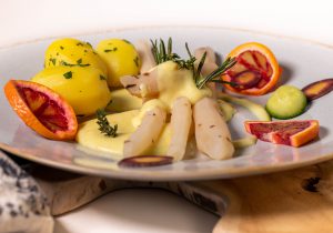 Die Schwarzwurzeln mit den Kartoffeln und der Orangenhollandaise servieren.