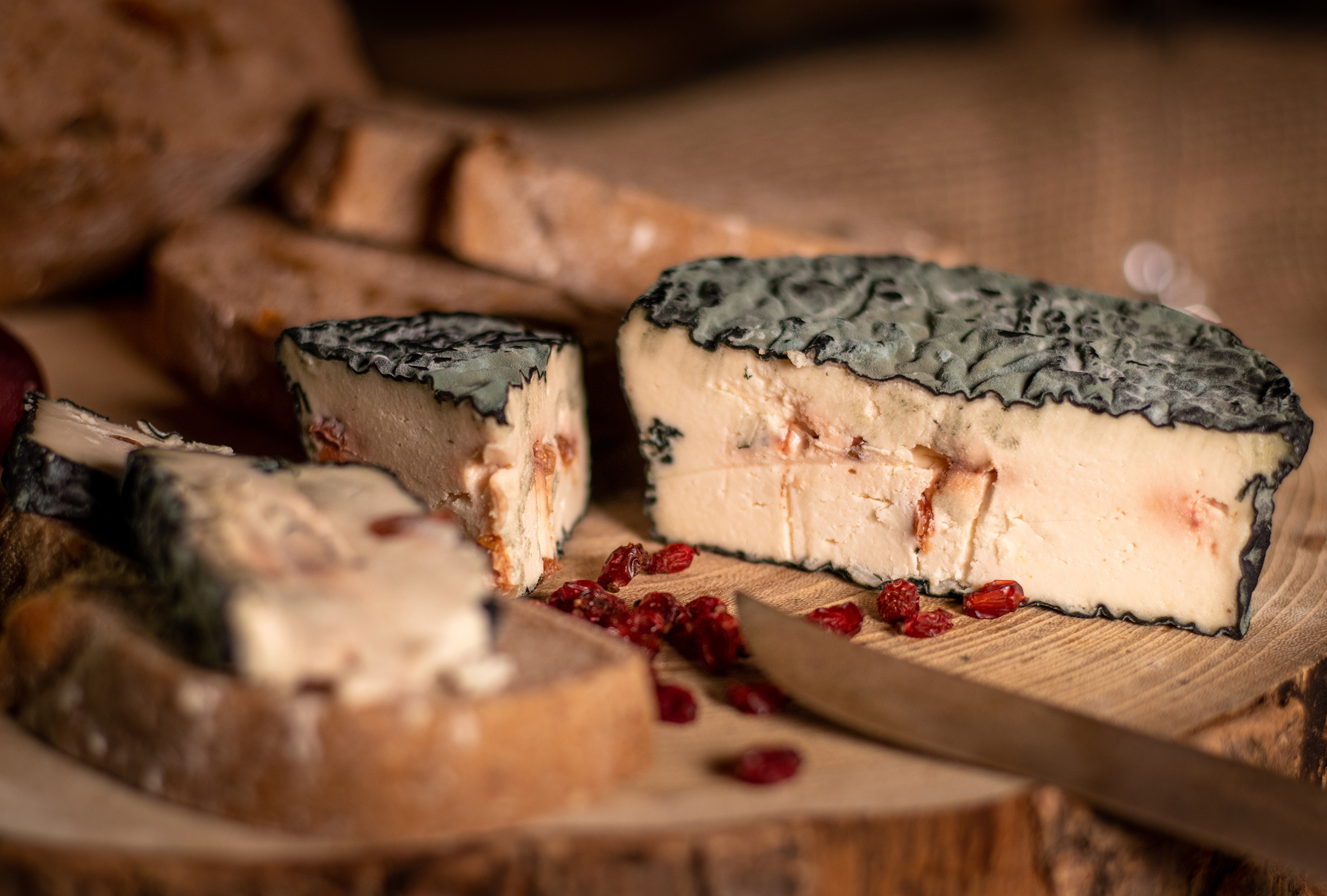 Einen süß-sauren Kontrast im Blauschimmelkäse kann man sehr gut mit getrockneten Berberitzen erzielen. Die leicht fruchtige Note passt sehr gut zu den herben Aromen der Blauschimmelkulturen.