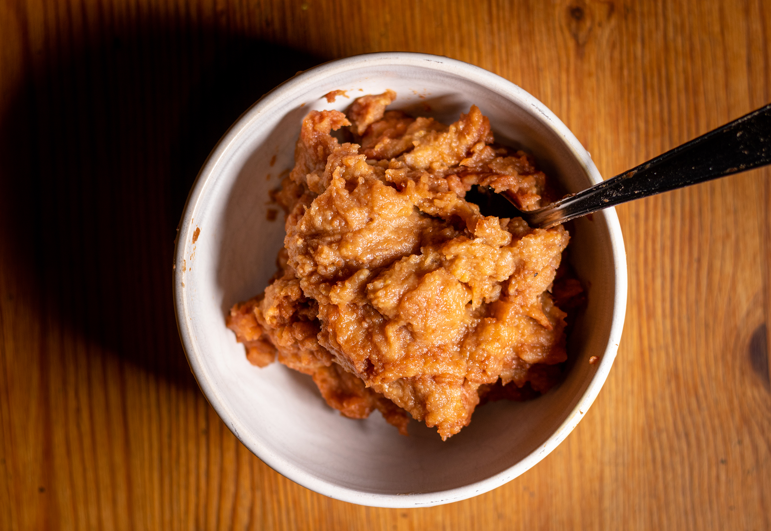 - Die veganen Butterwürfel dazu geben und mixen bis sich ein pastenartiger Teig formt. Das passiert von alleine, nach einer ausgiebigen Krümelphase.
